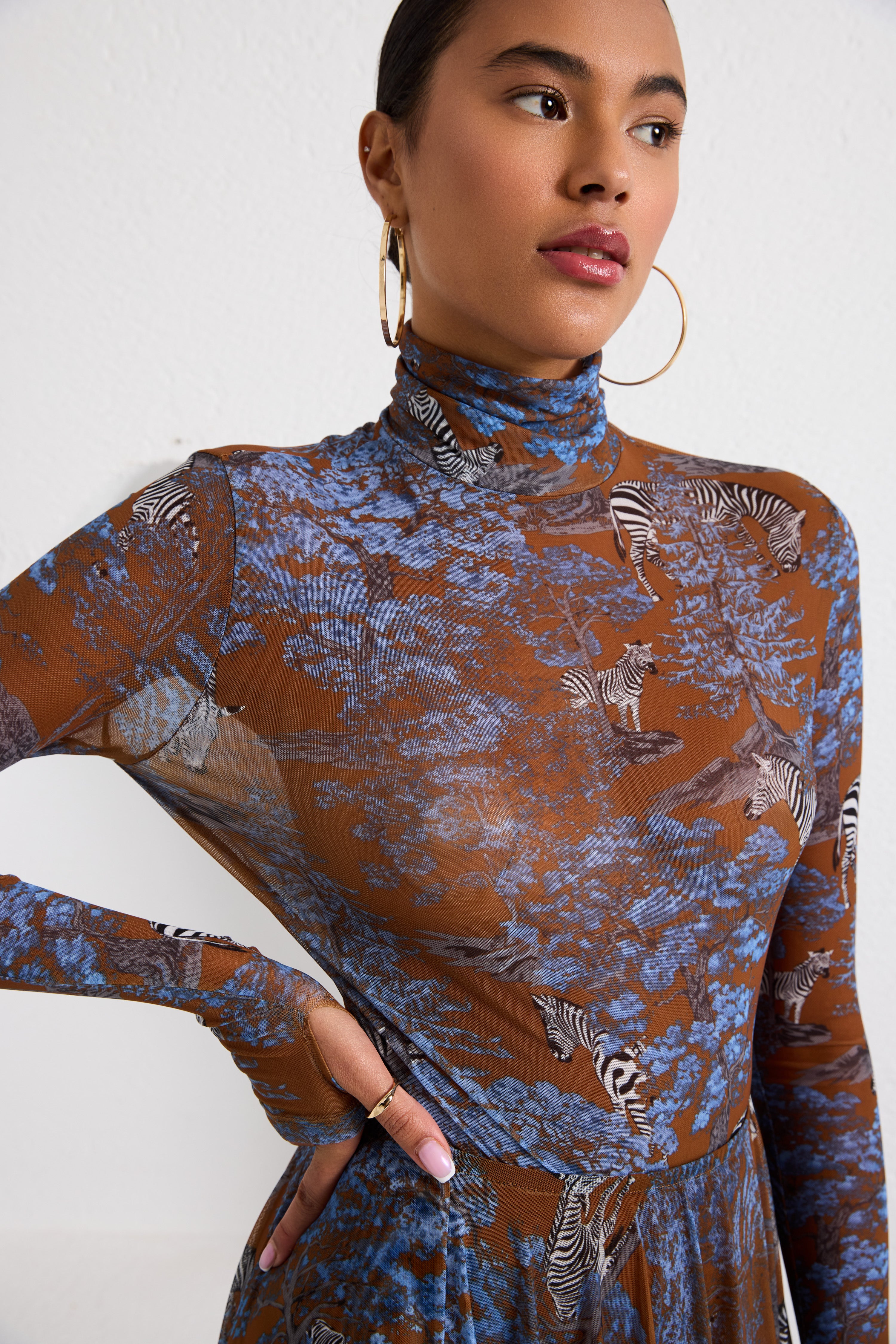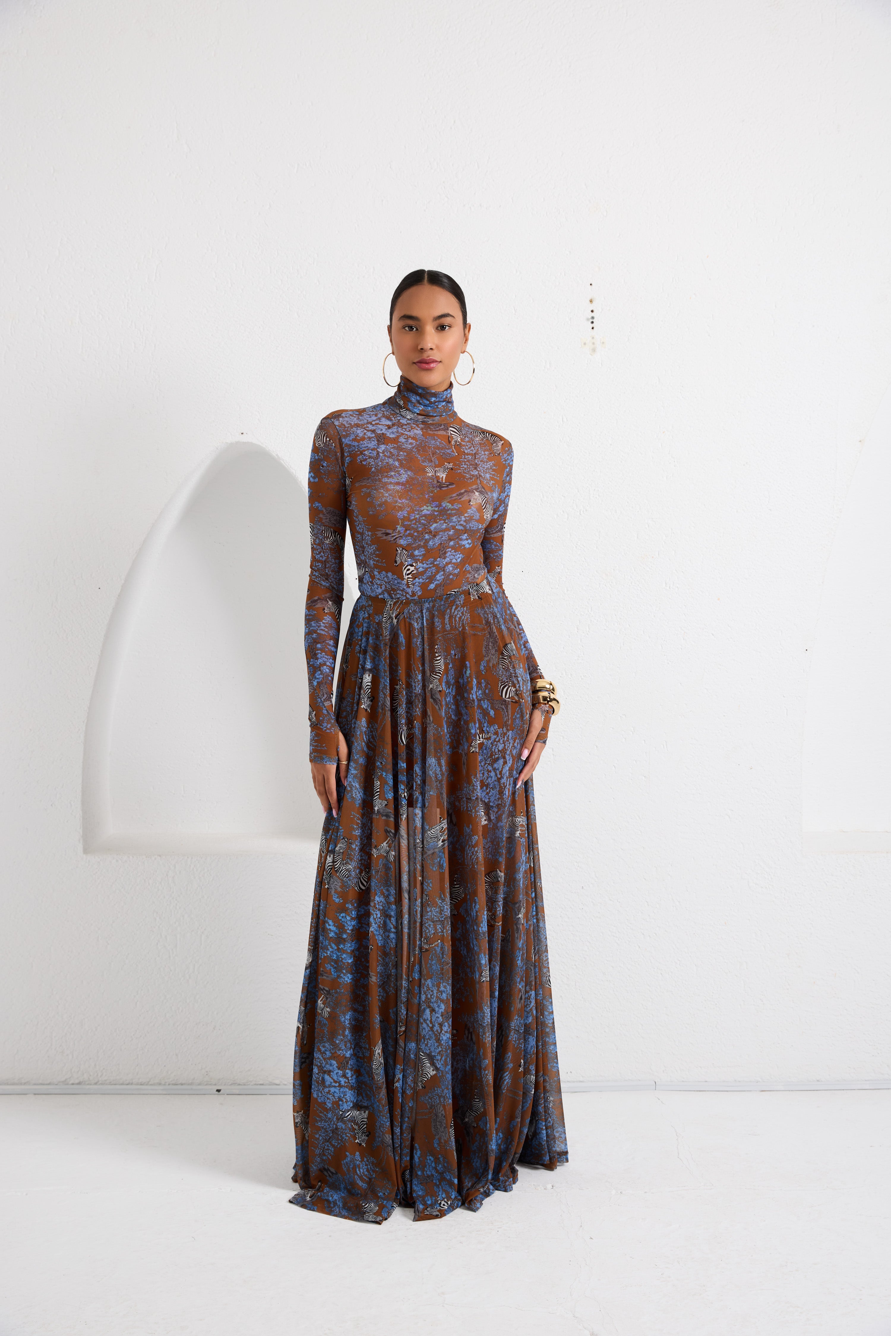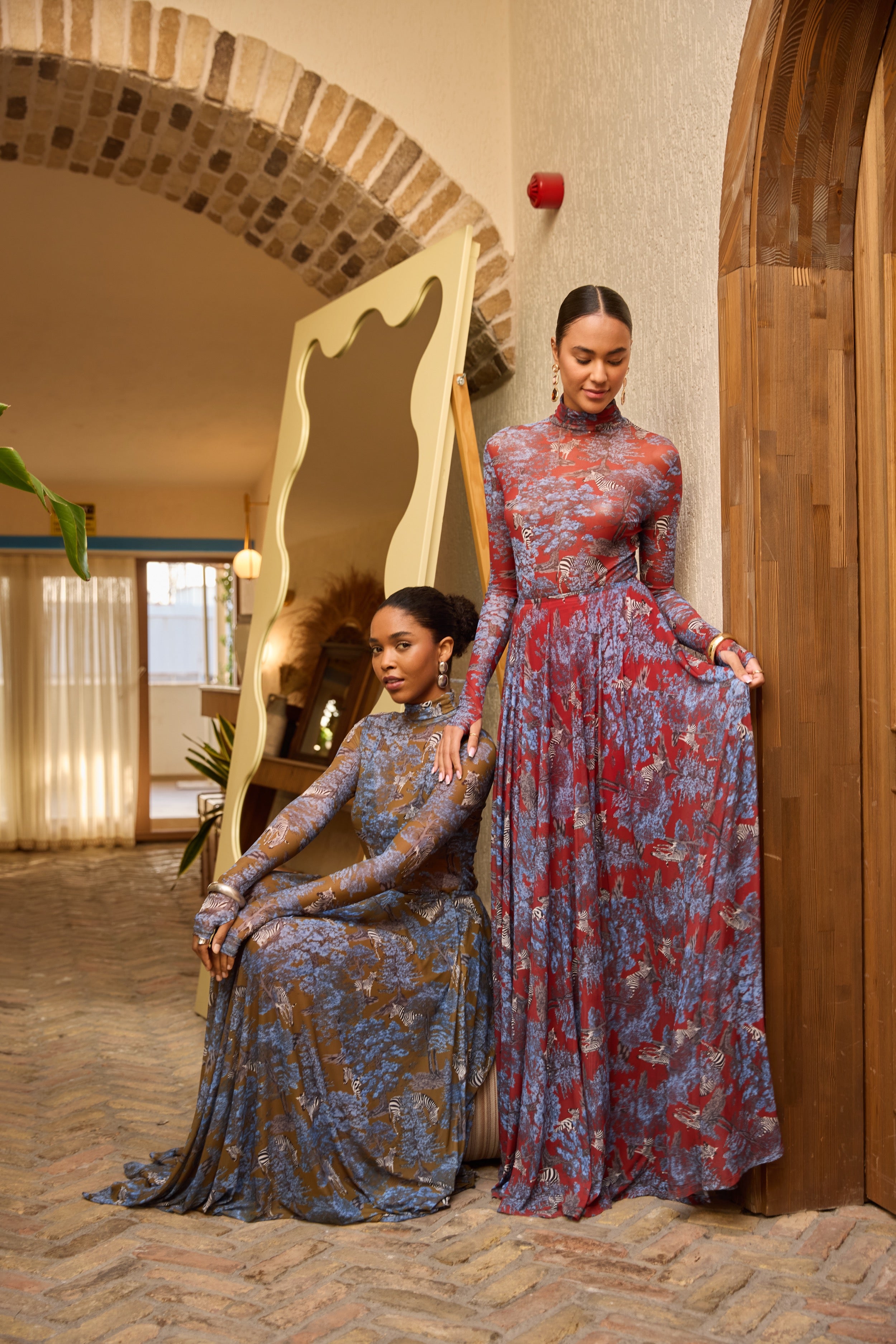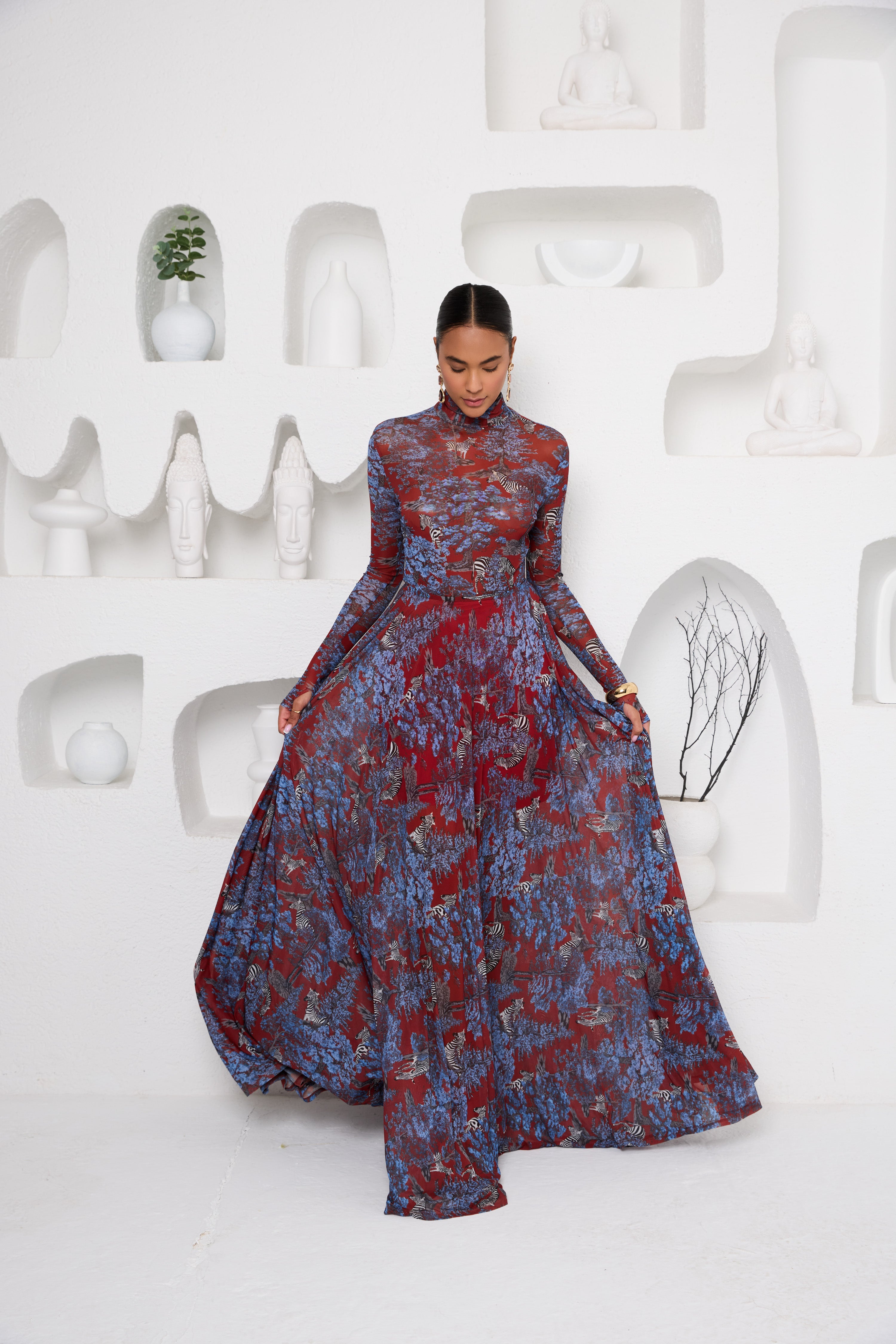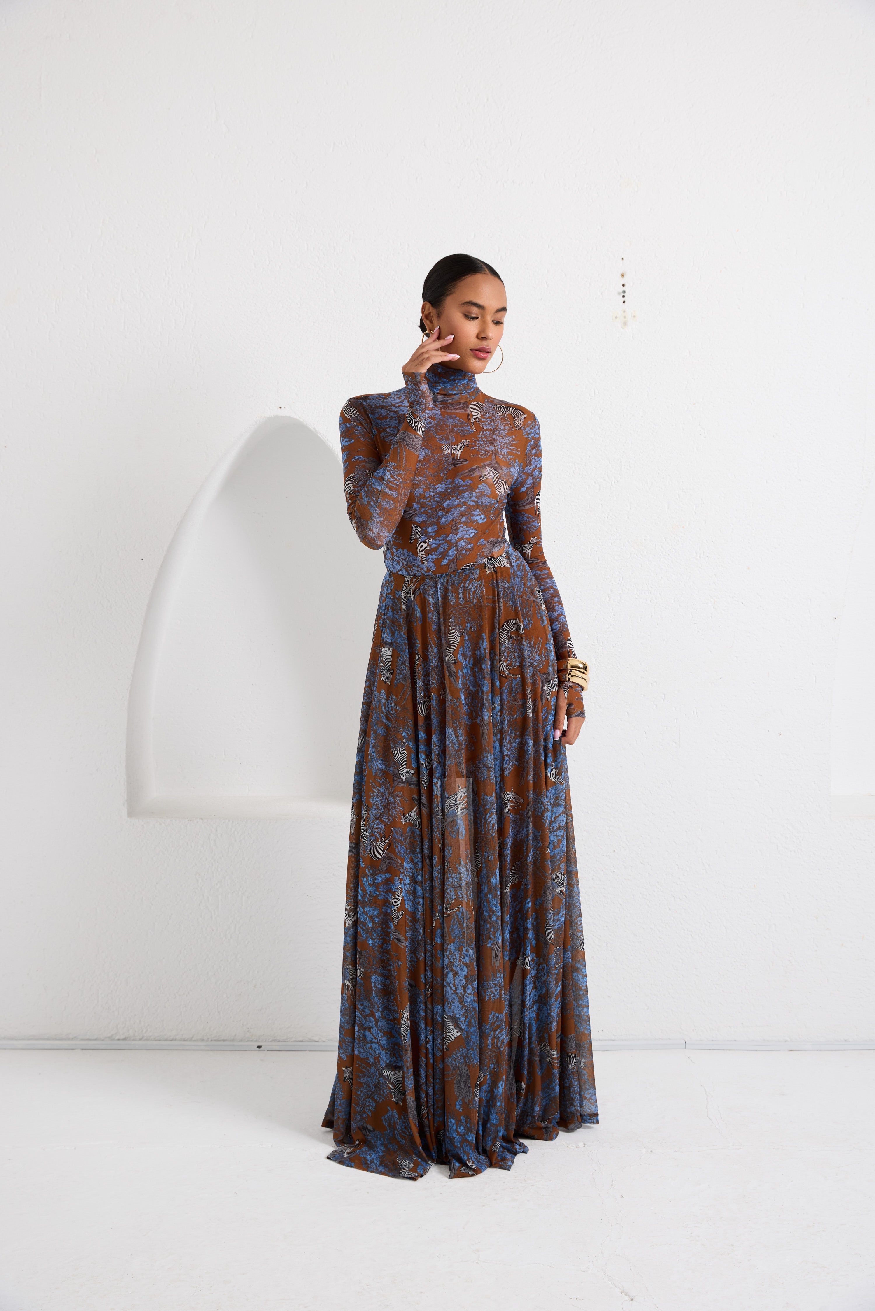 The Dream Safari Set is a two-piece showstopper crafted from our signature 4-way stretch mesh. Featuring a fitted bodysuit with thumbhole sleeves and a high-waisted, flowy skirt with an elastic waistband, this look blends comfort with effortless drama. The skirt is fully lined for coverage, while the bodysuit remains sheer for styling versatility. Adorned in our original Dream Safari print, an imaginative take on untamed nature. It’s available in Crimson, Olive, and Earth Brown. Wear your story. Wear Biageli. Recommend: XS/S (US Size 4-6), M/L(US 8-10), L/XL (US 12-14). Skirt Length: 123 cm long across