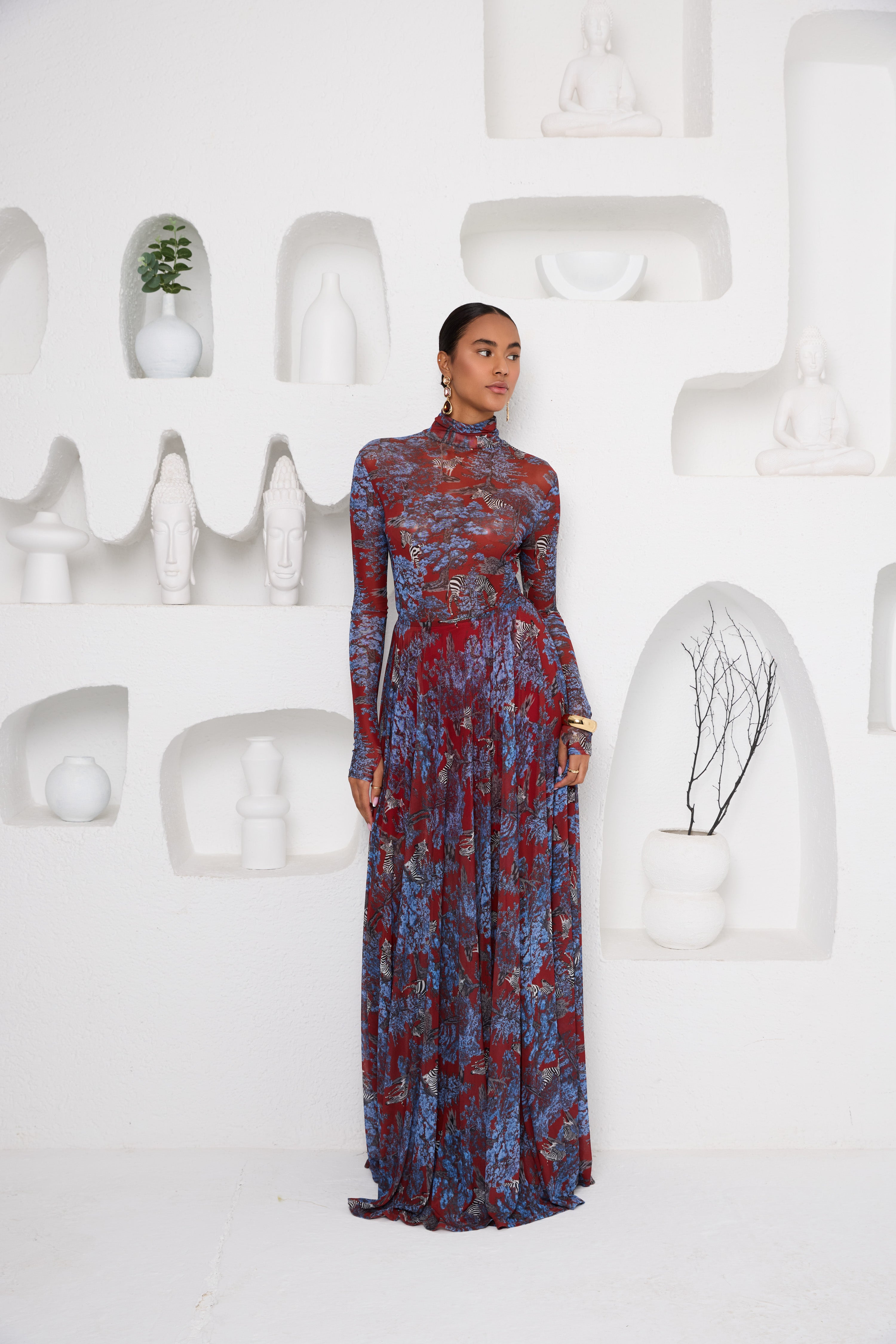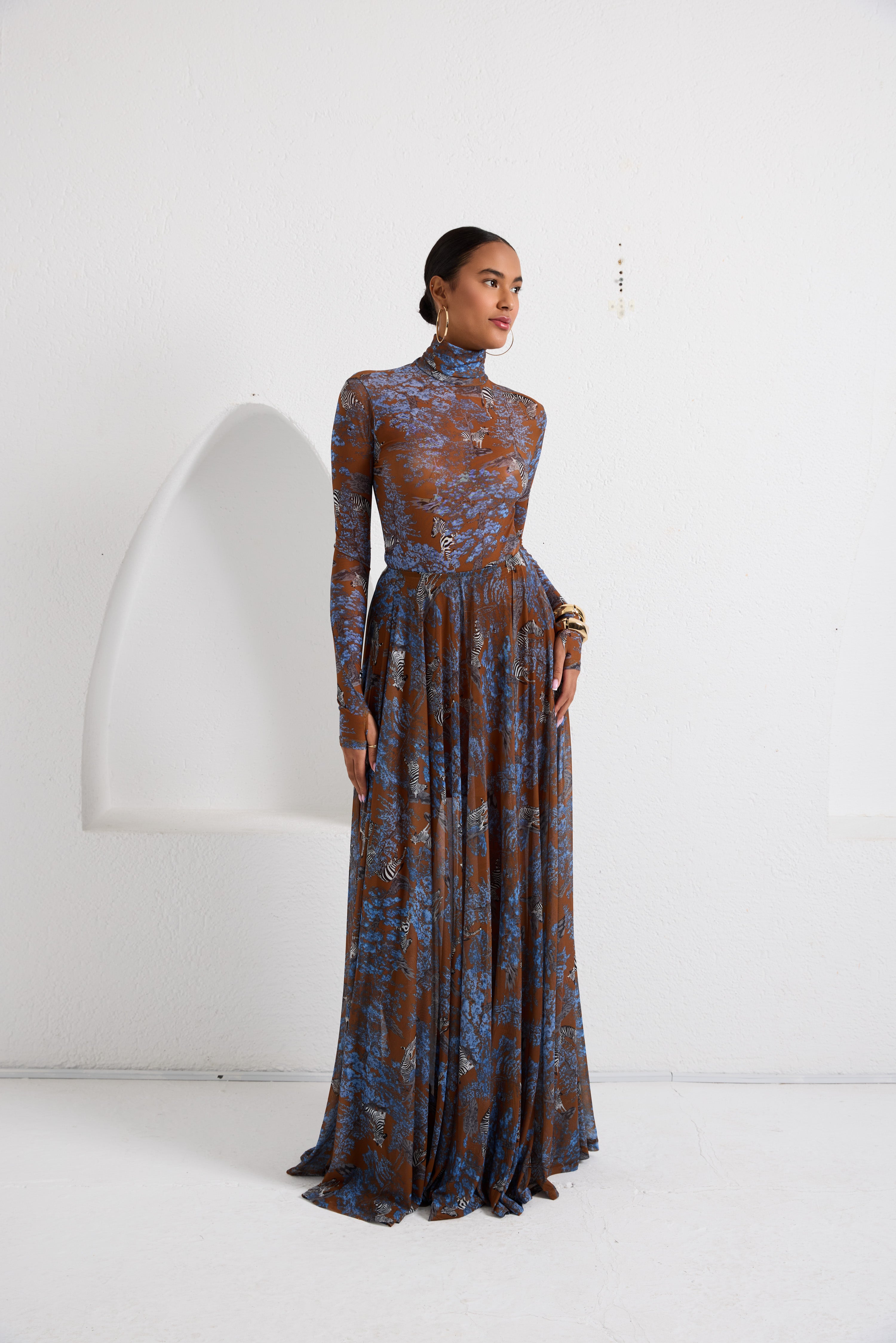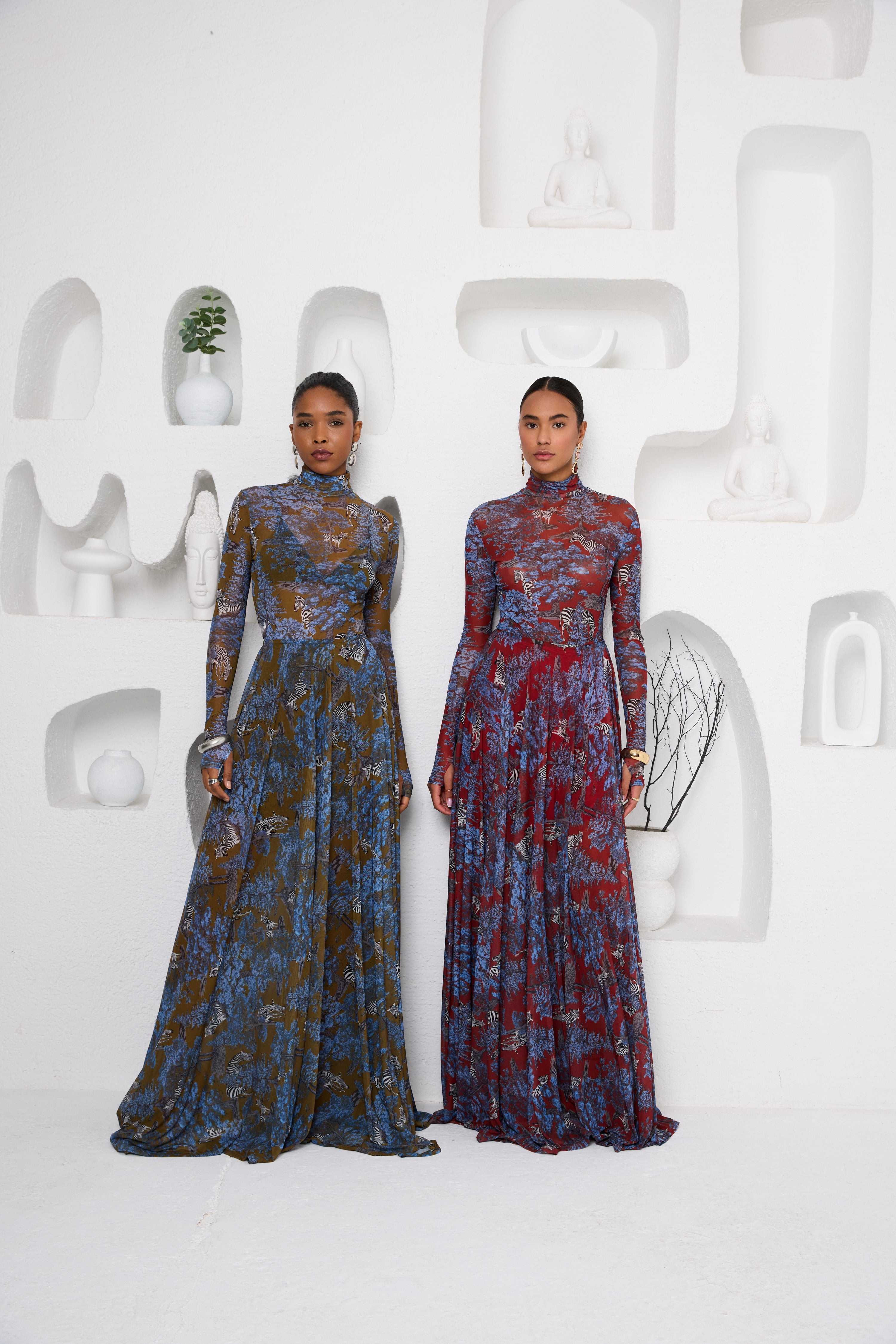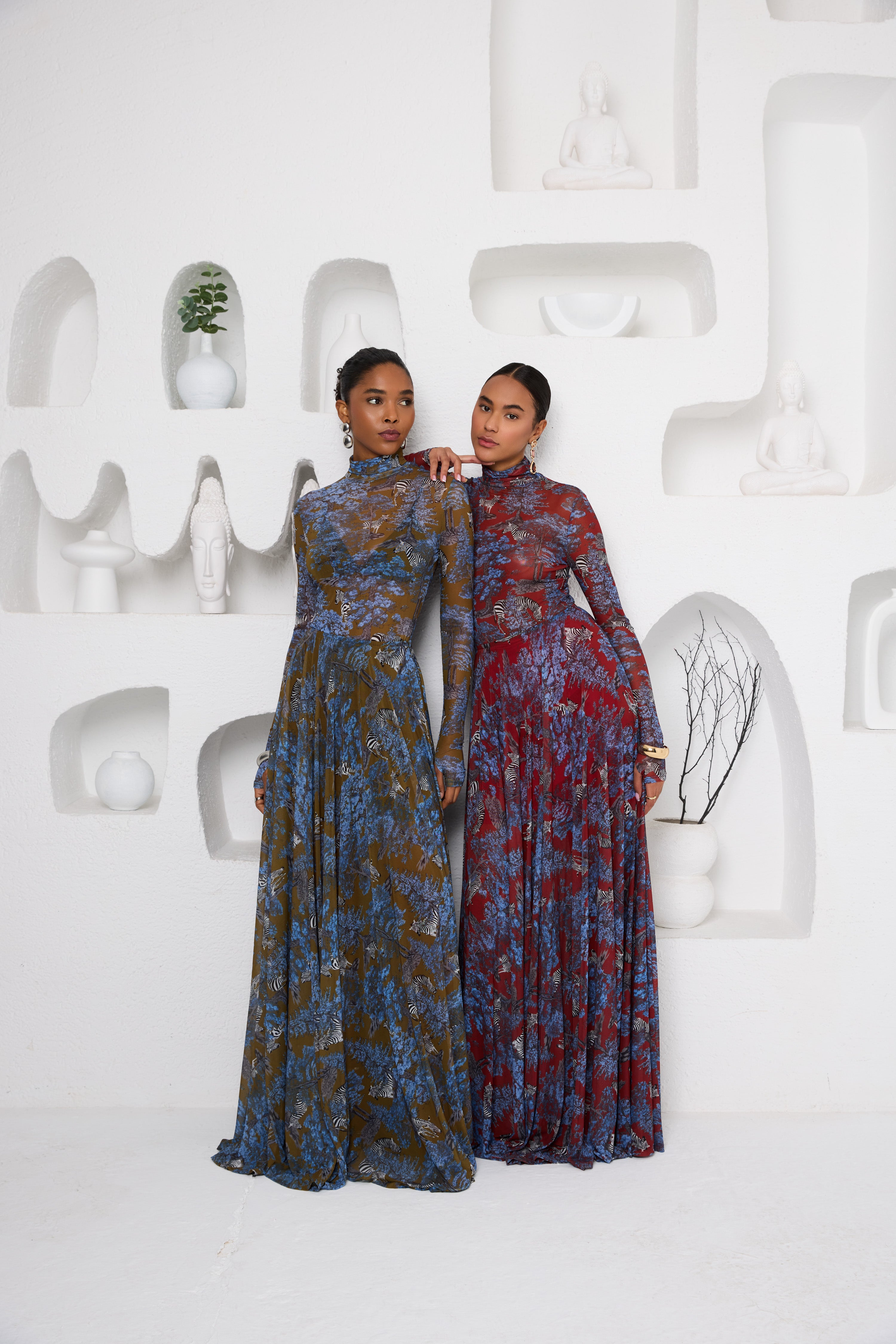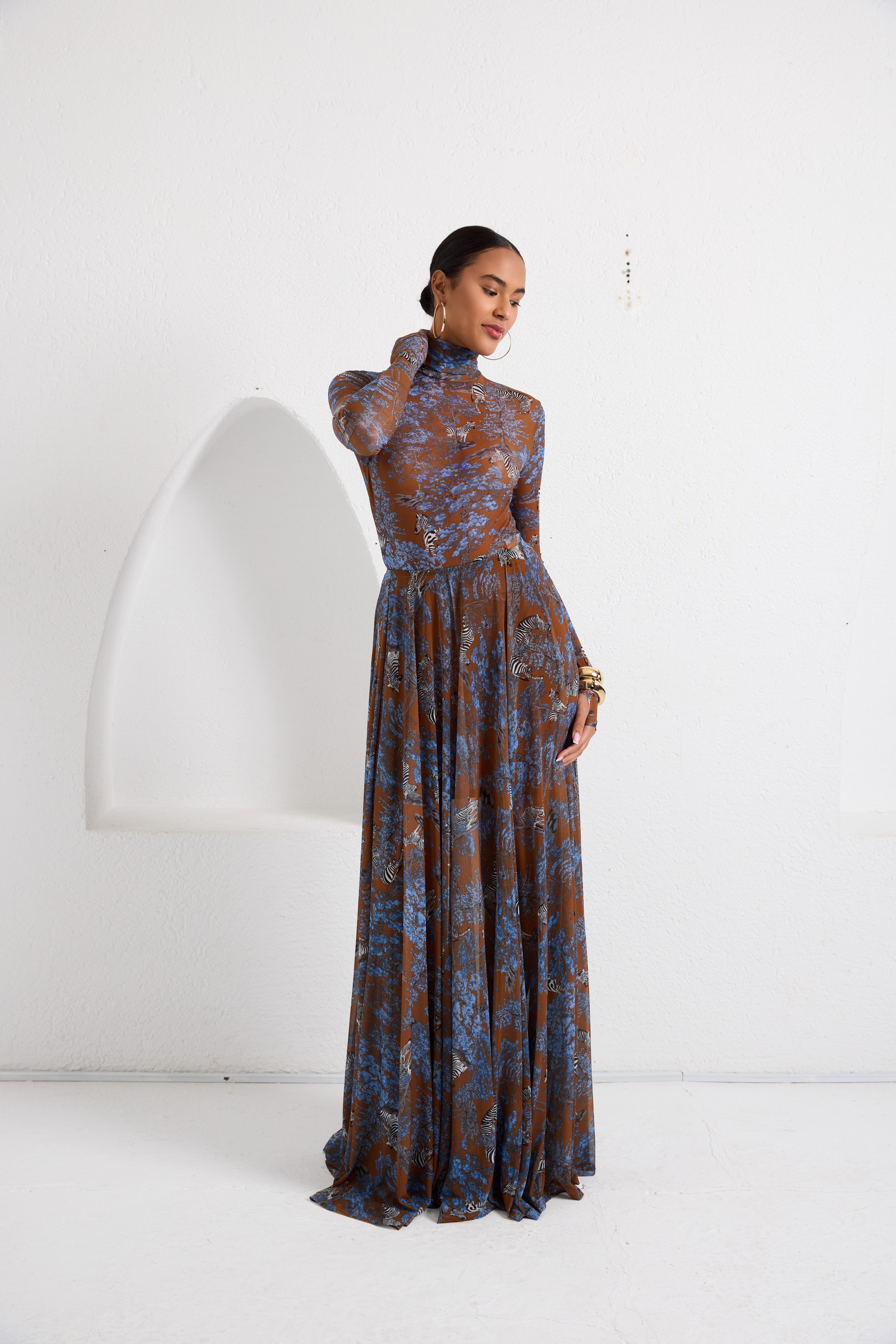The Dream Safari Set is a two-piece showstopper crafted from our signature 4-way stretch mesh. Featuring a fitted bodysuit with thumbhole sleeves and a high-waisted, flowy skirt with an elastic waistband, this look blends comfort with effortless drama. The skirt is fully lined for coverage, while the bodysuit remains sheer for styling versatility. Adorned in our original Dream Safari print, an imaginative take on untamed nature. It’s available in Crimson, Olive, and Earth Brown. Wear your story. Wear Biageli. Recommend: XS/S (US Size 4-6), M/L(US 8-10), L/XL (US 12-14). Skirt Length: 123 cm long across