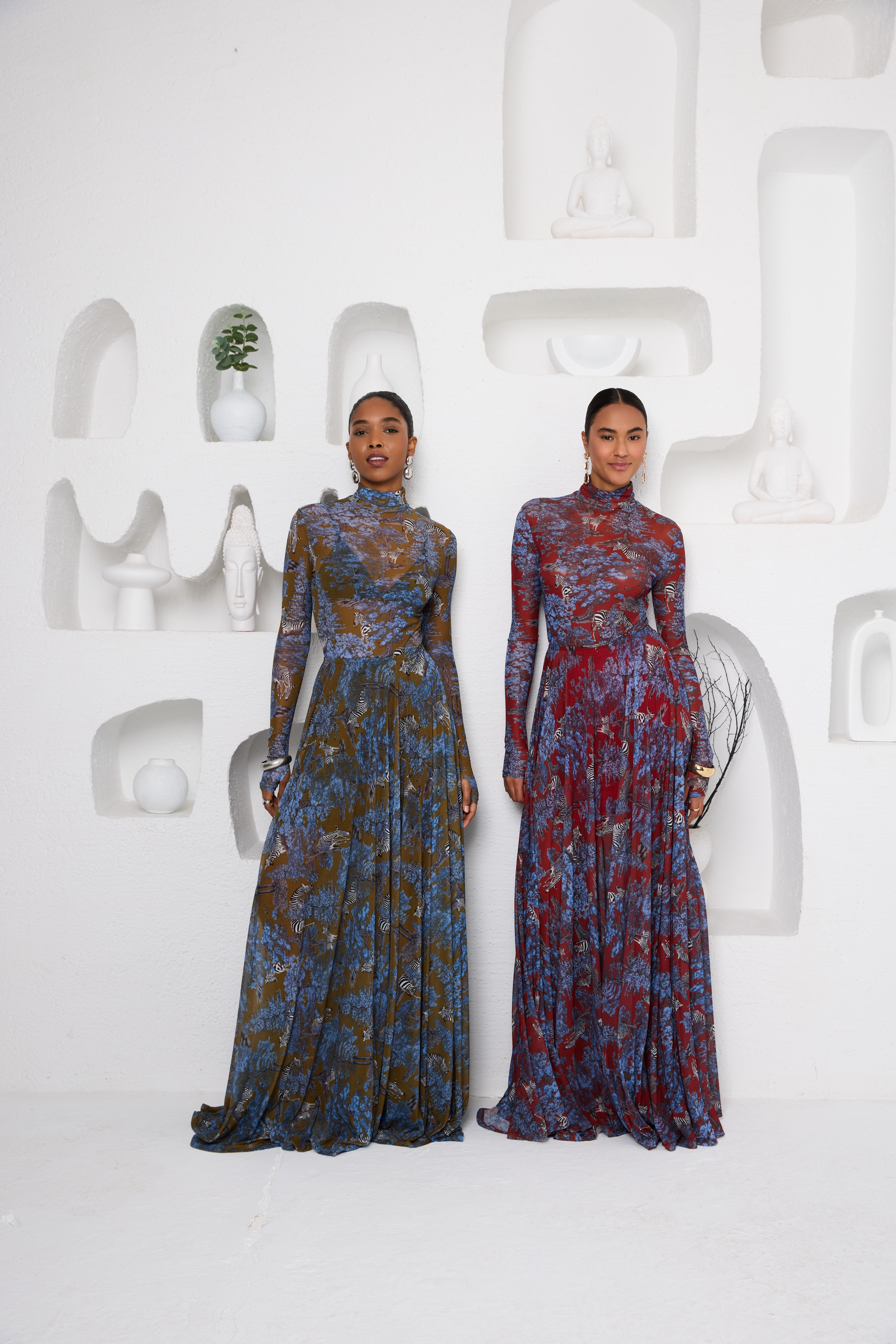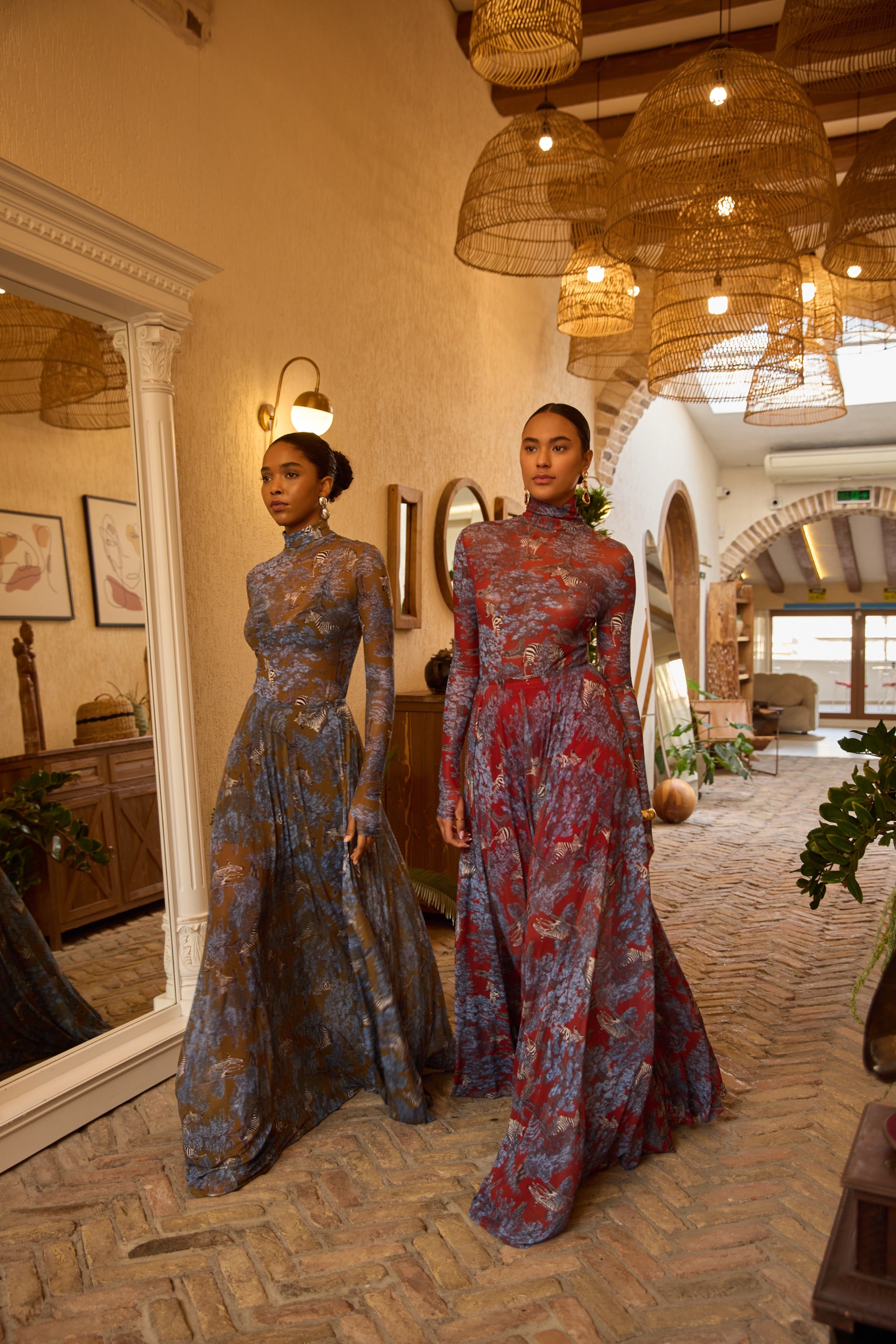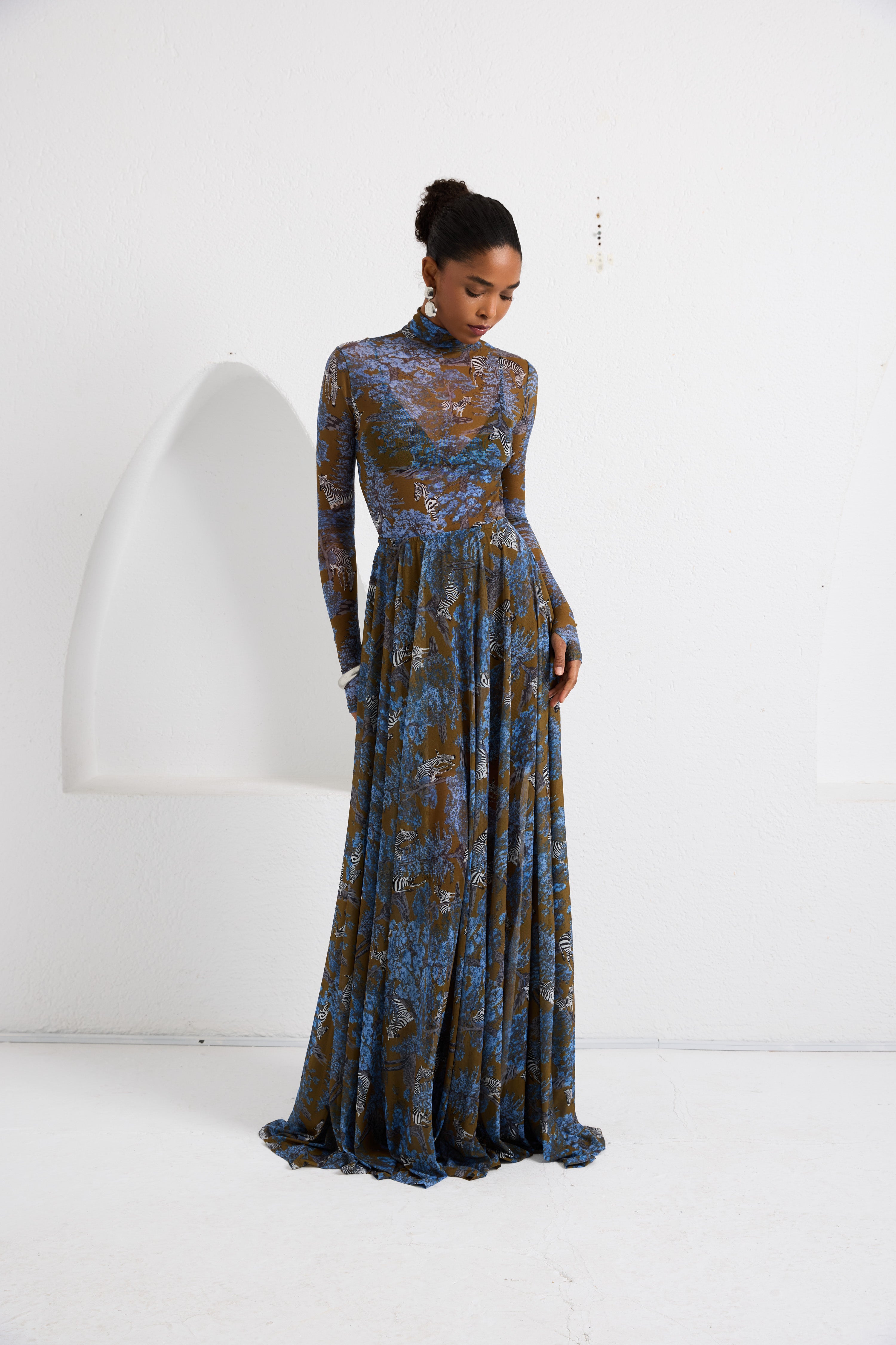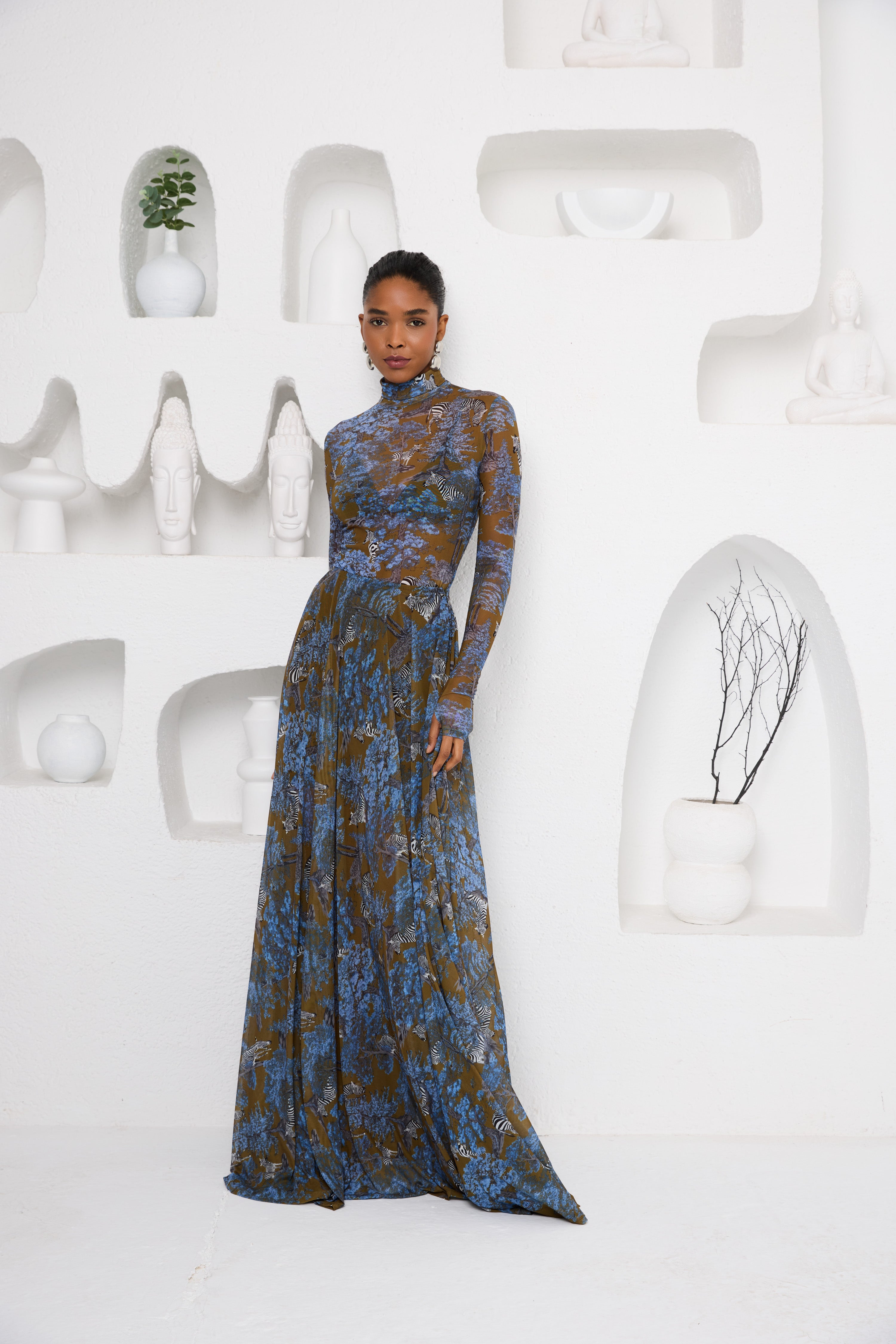 The Dream Safari Set is a two-piece showstopper crafted from our signature 4-way stretch mesh. Featuring a fitted bodysuit with thumbhole sleeves and a high-waisted, flowy skirt with an elastic waistband, this look blends comfort with effortless drama. The skirt is fully lined for coverage, while the bodysuit remains sheer for styling versatility. Adorned in our original Dream Safari print, an imaginative take on untamed nature. It’s available in Crimson, Olive, and Earth Brown. Wear your story. Wear Biageli. Recommend: XS/S (US Size 4-6), M/L(US 8-10), L/XL (US 12-14). Skirt Length: 123 cm long across