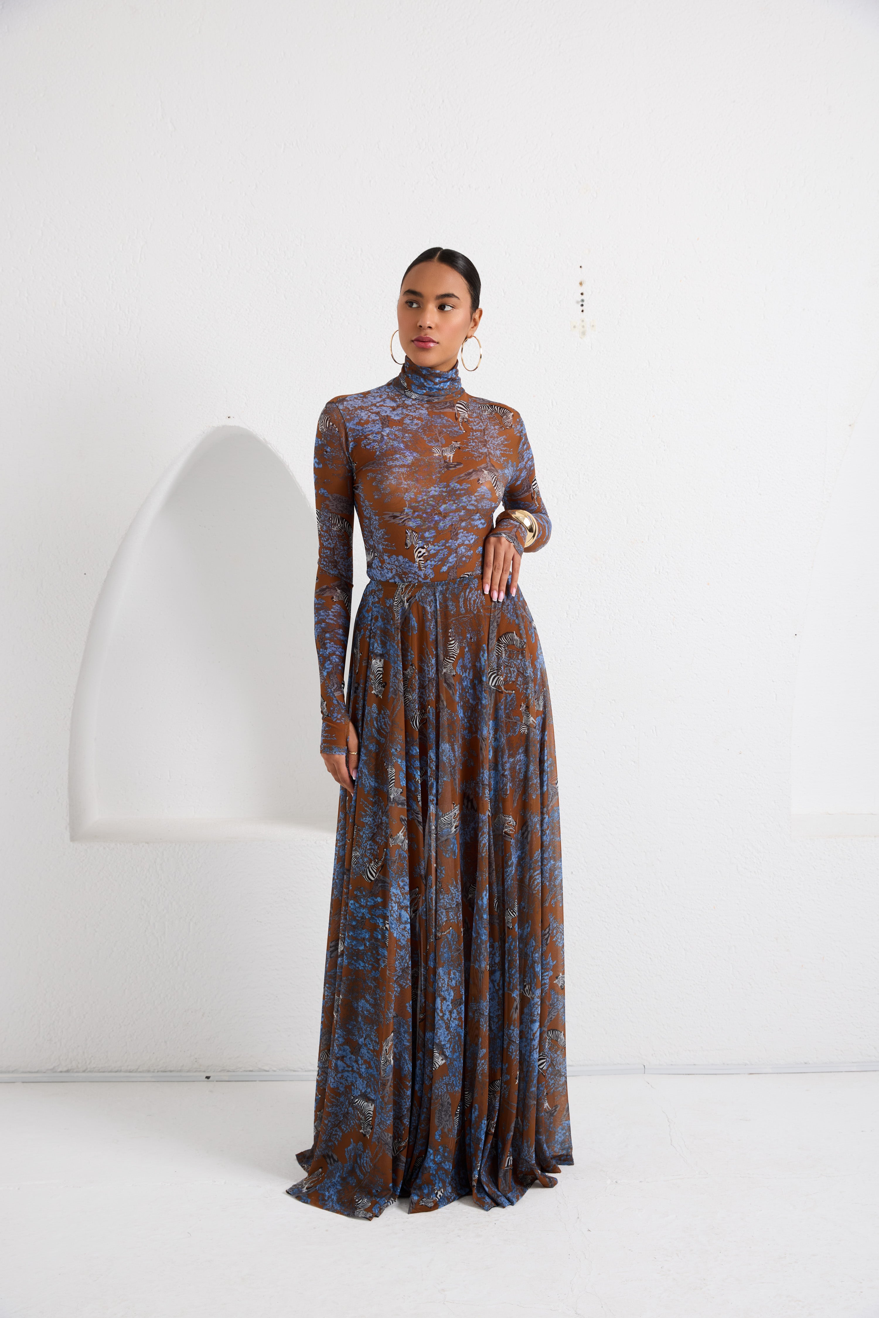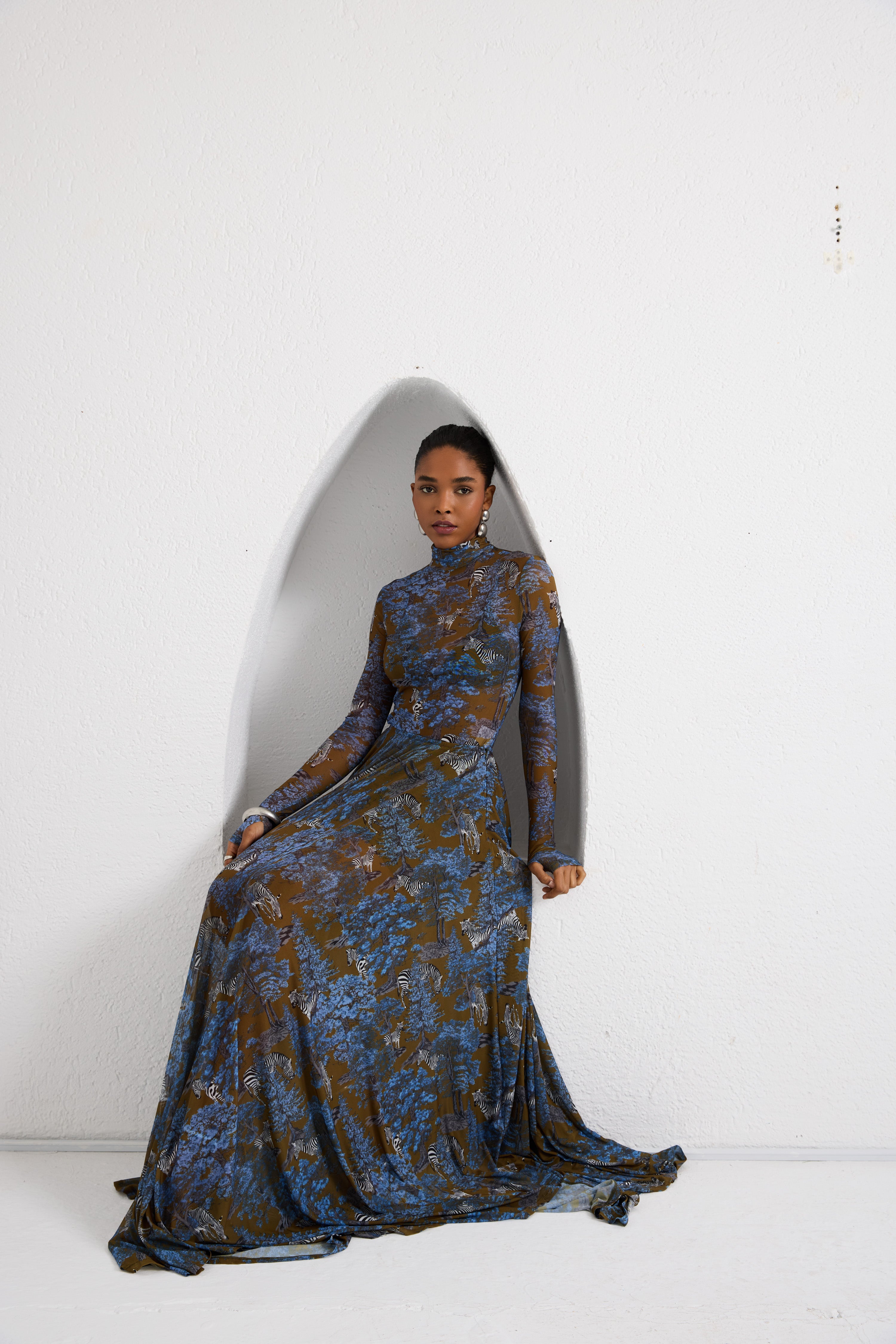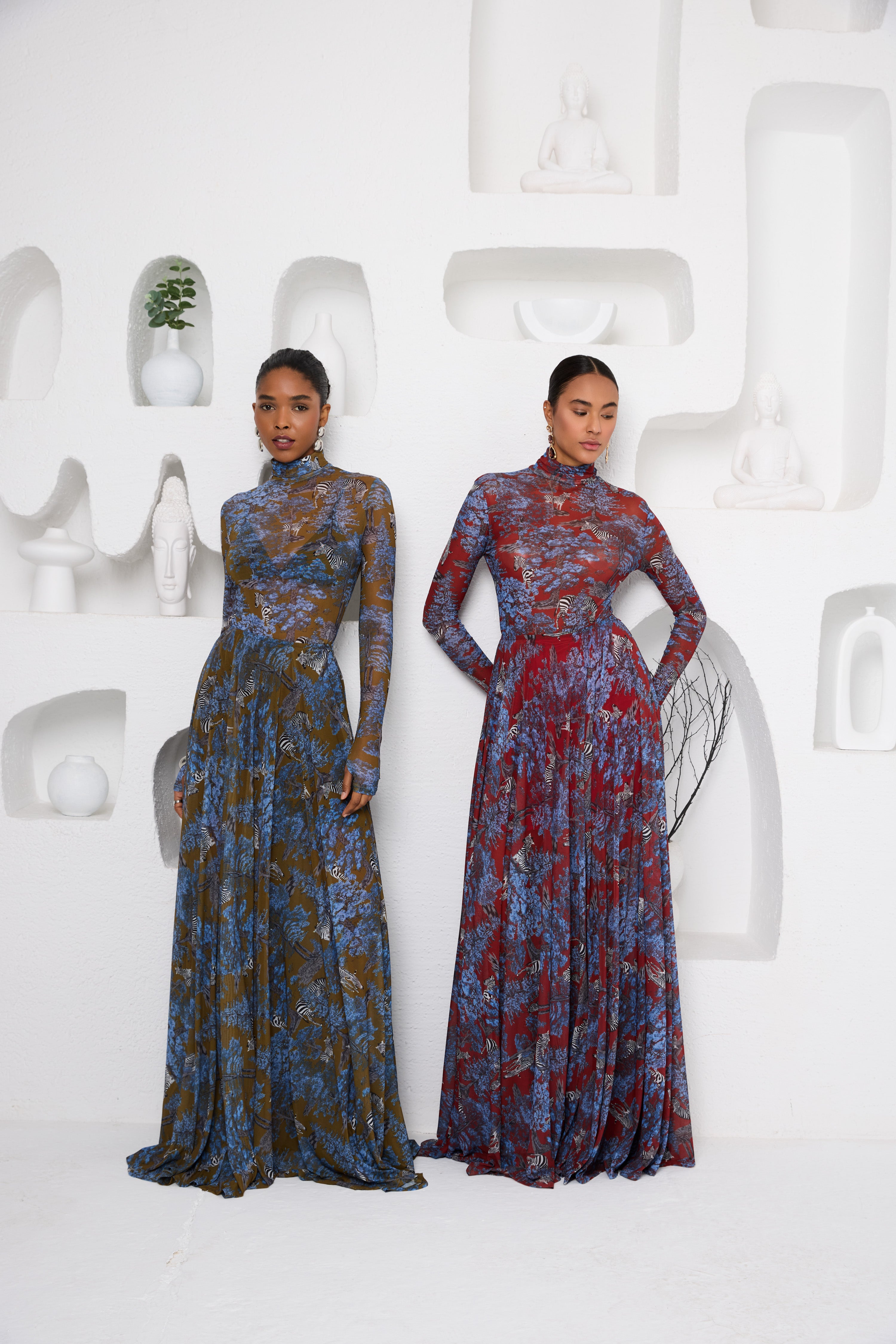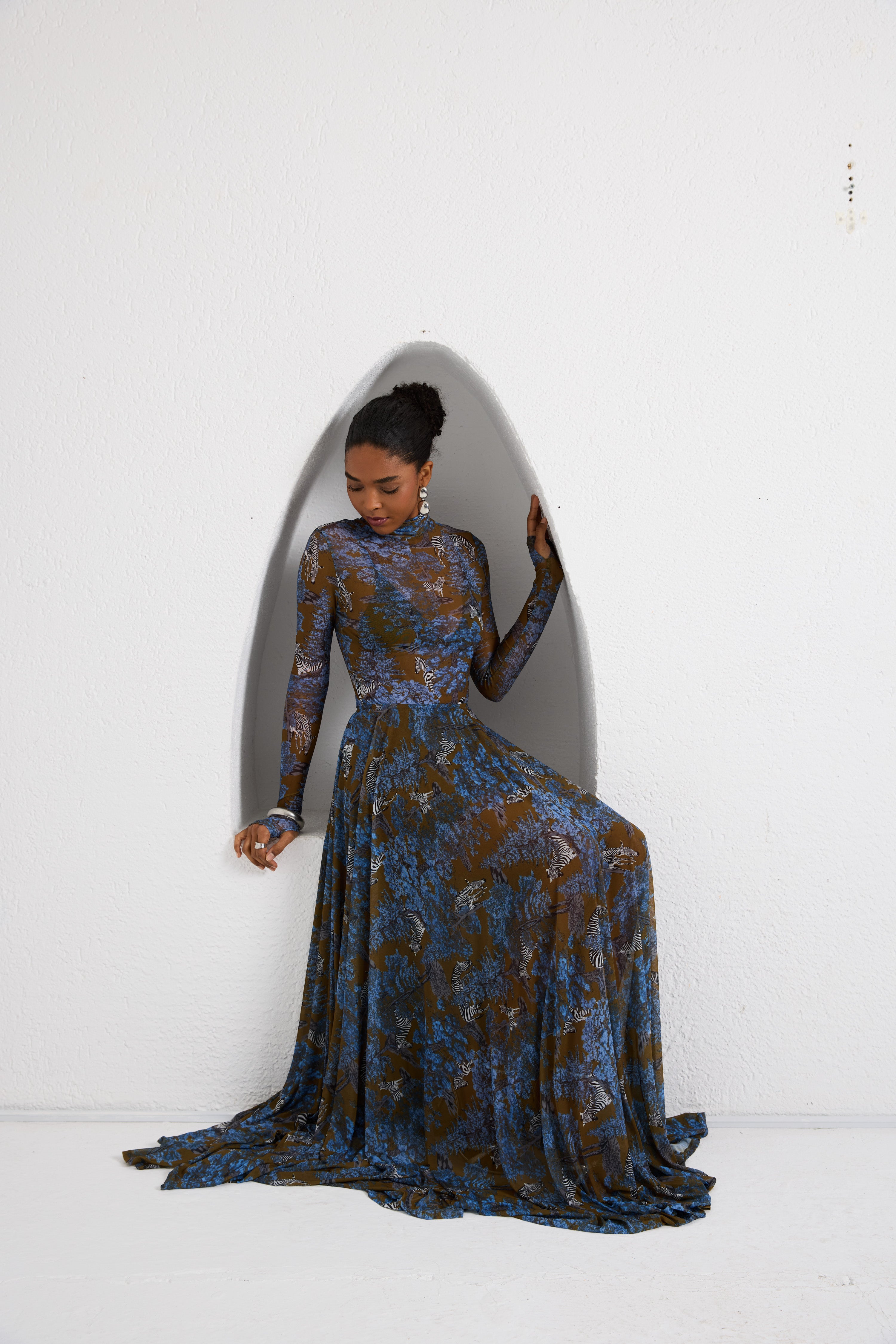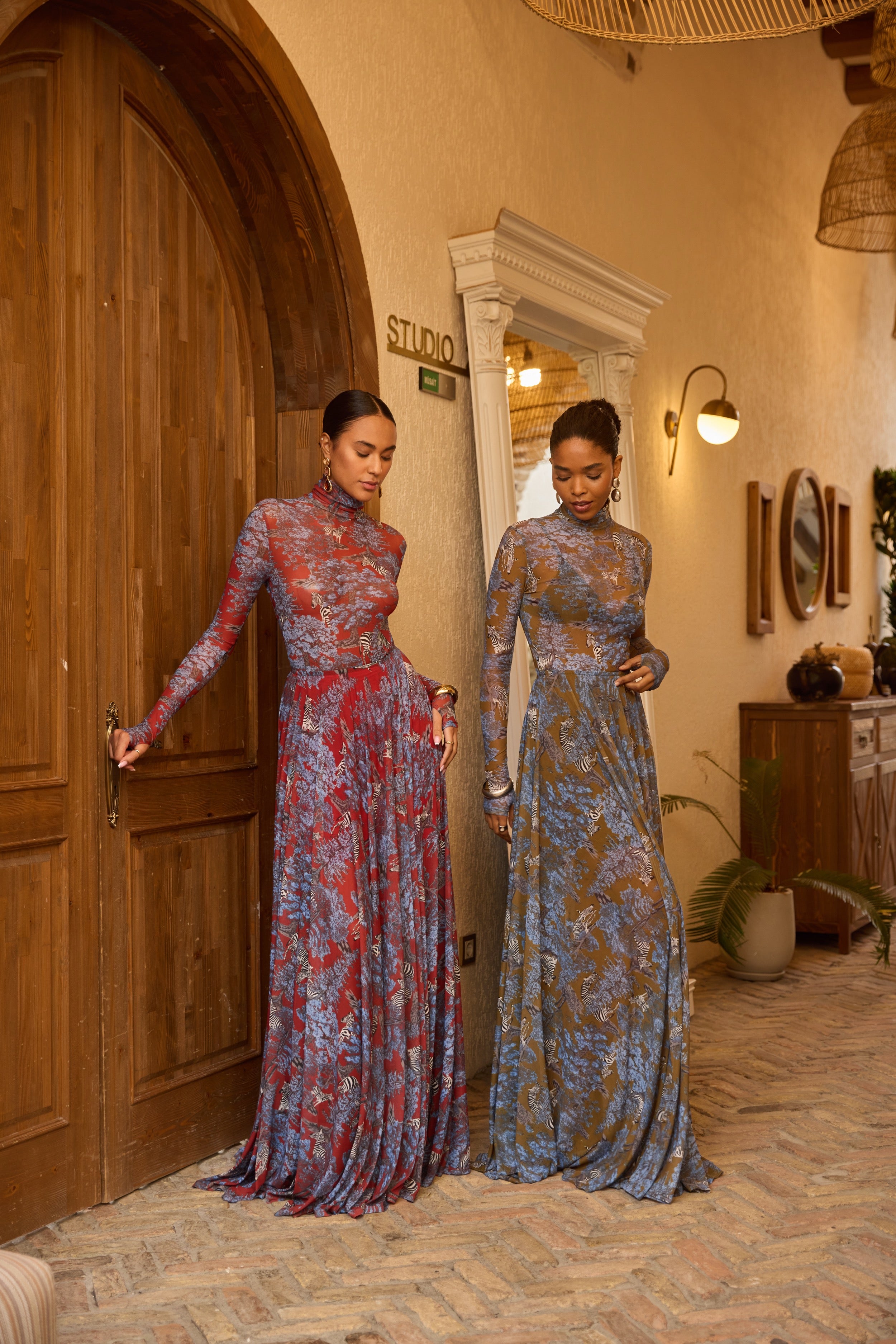 The Dream Safari Set is a two-piece showstopper crafted from our signature 4-way stretch mesh. Featuring a fitted bodysuit with thumbhole sleeves and a high-waisted, flowy skirt with an elastic waistband, this look blends comfort with effortless drama. The skirt is fully lined for coverage, while the bodysuit remains sheer for styling versatility. Adorned in our original Dream Safari print, an imaginative take on untamed nature. It’s available in Crimson, Olive, and Earth Brown. Wear your story. Wear Biageli. Recommend: XS/S (US Size 4-6), M/L(US 8-10), L/XL (US 12-14). Skirt Length: 123 cm long across