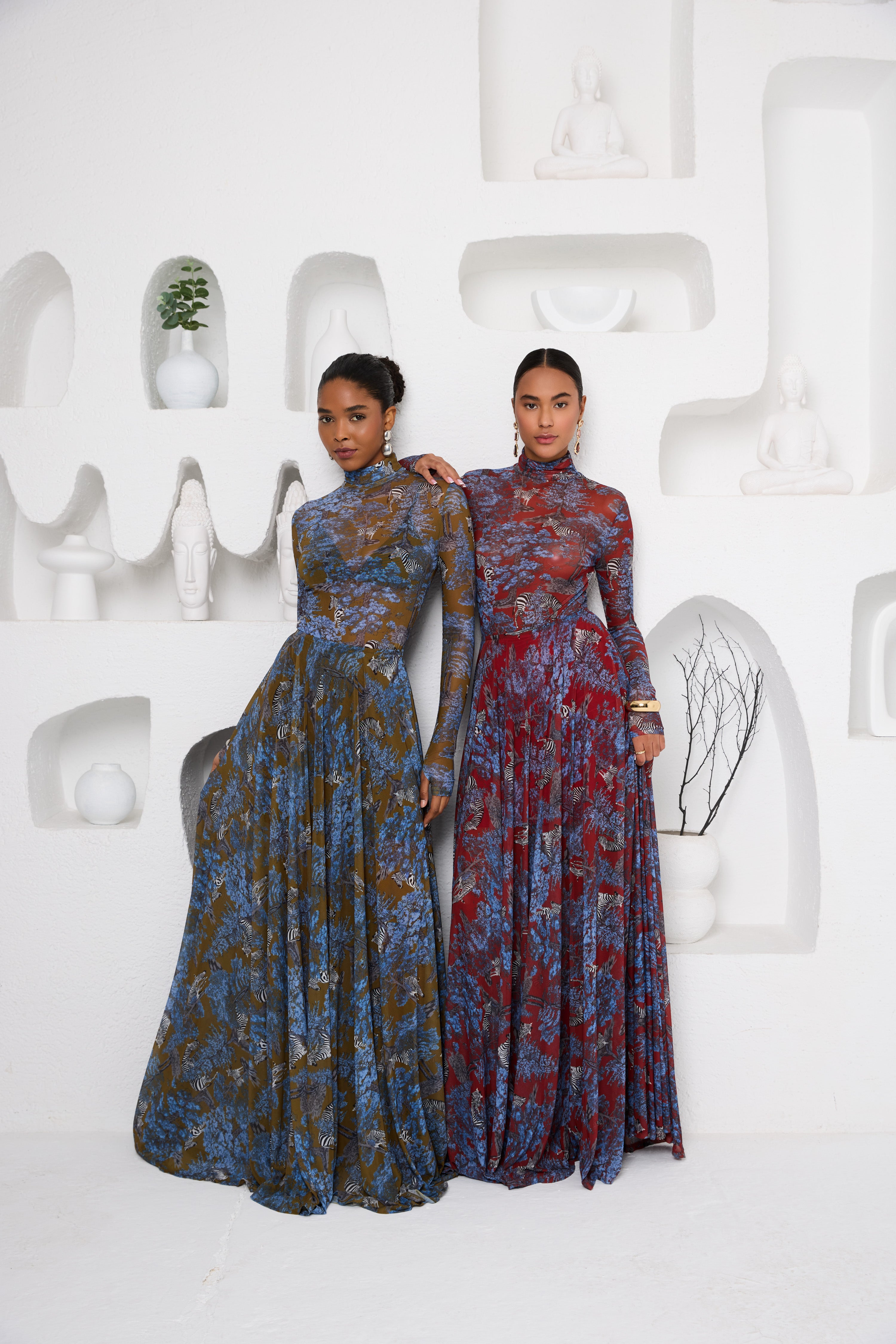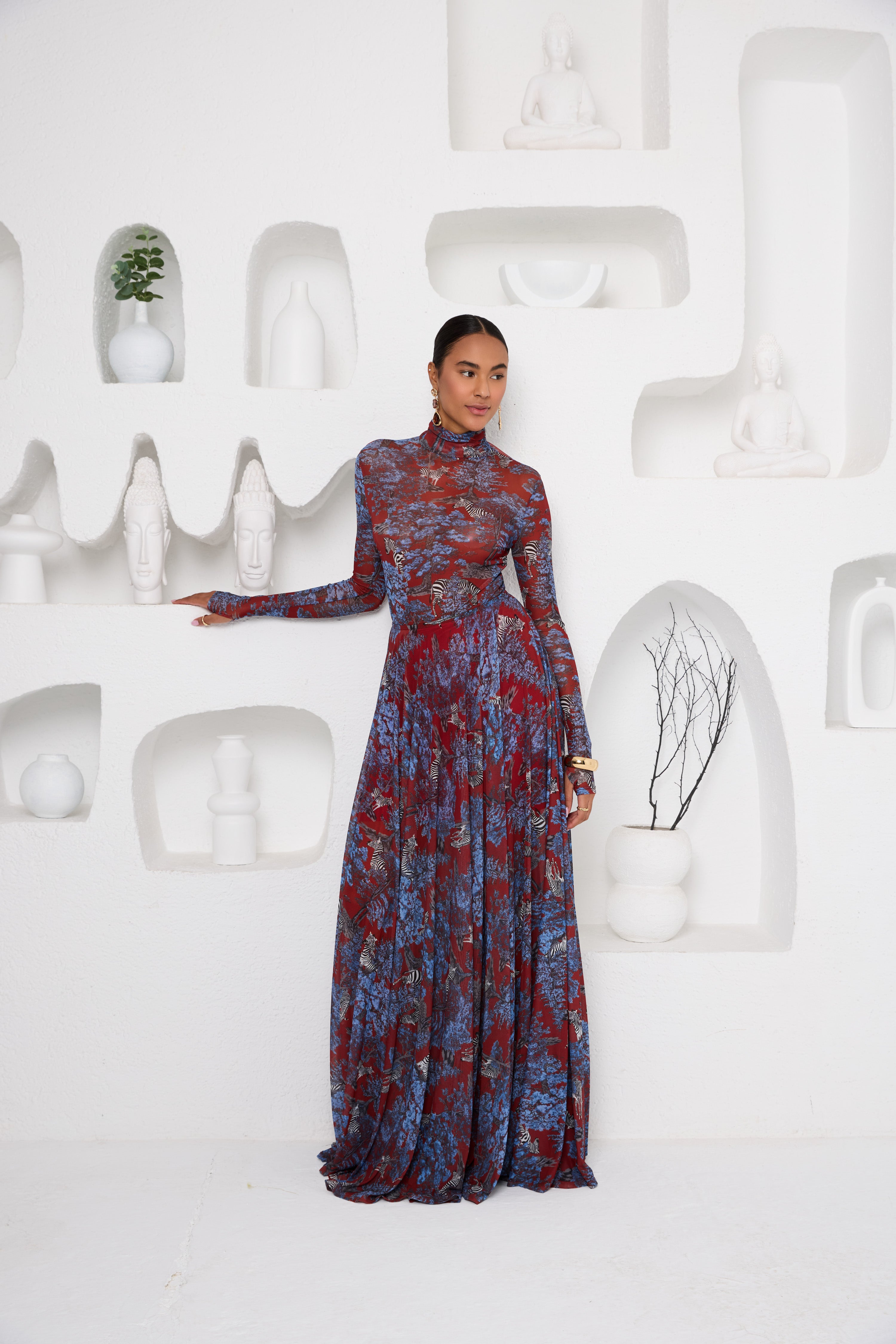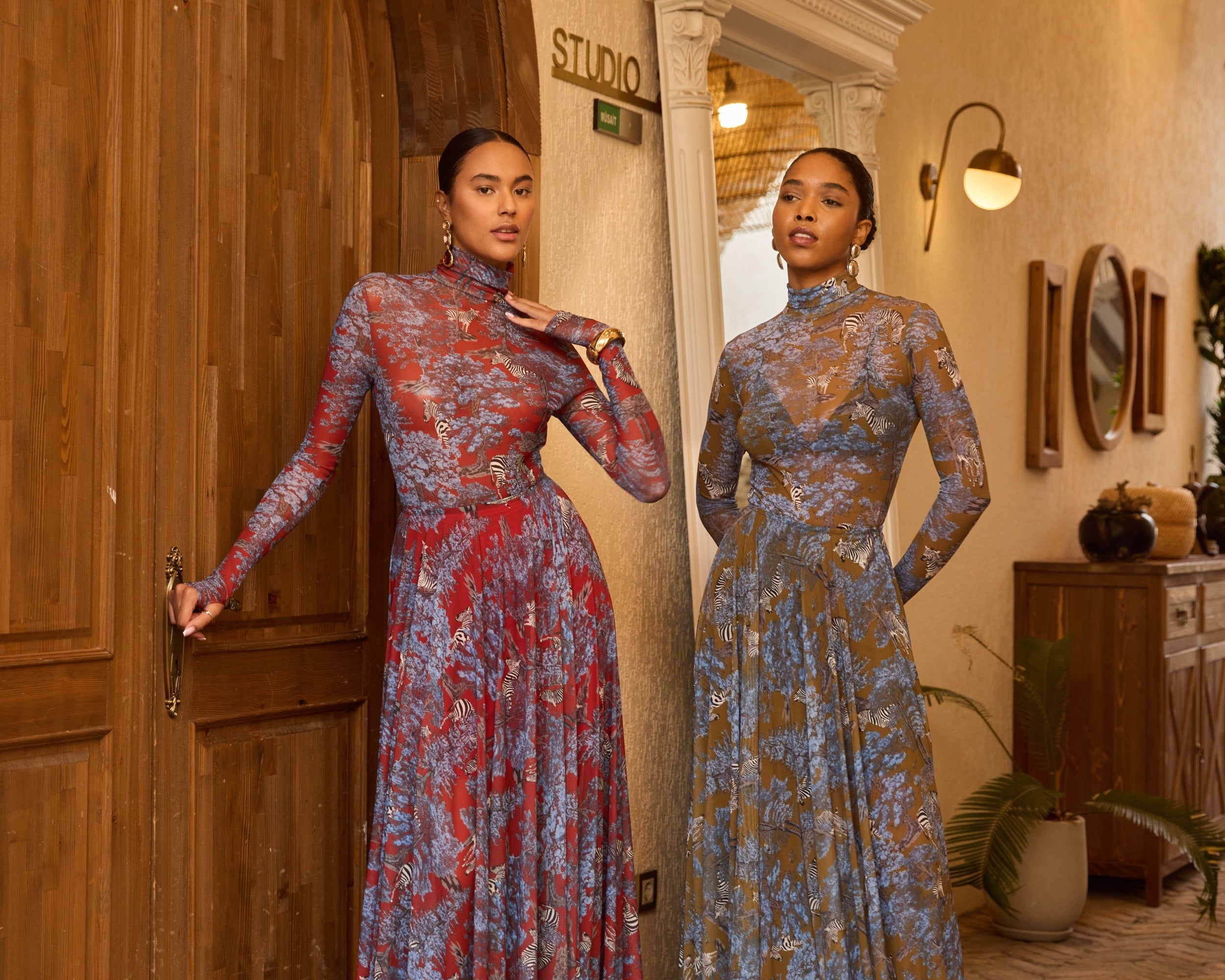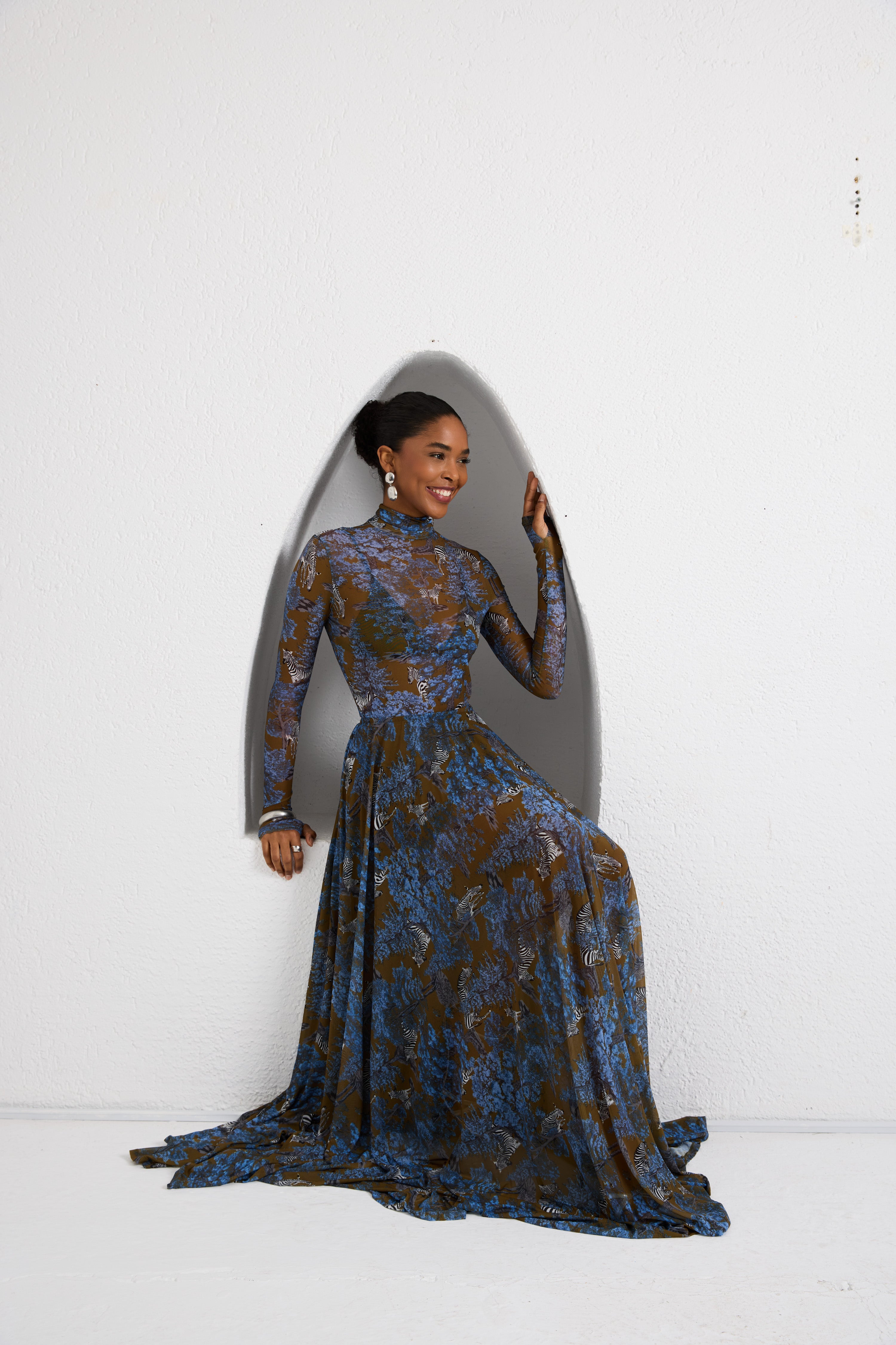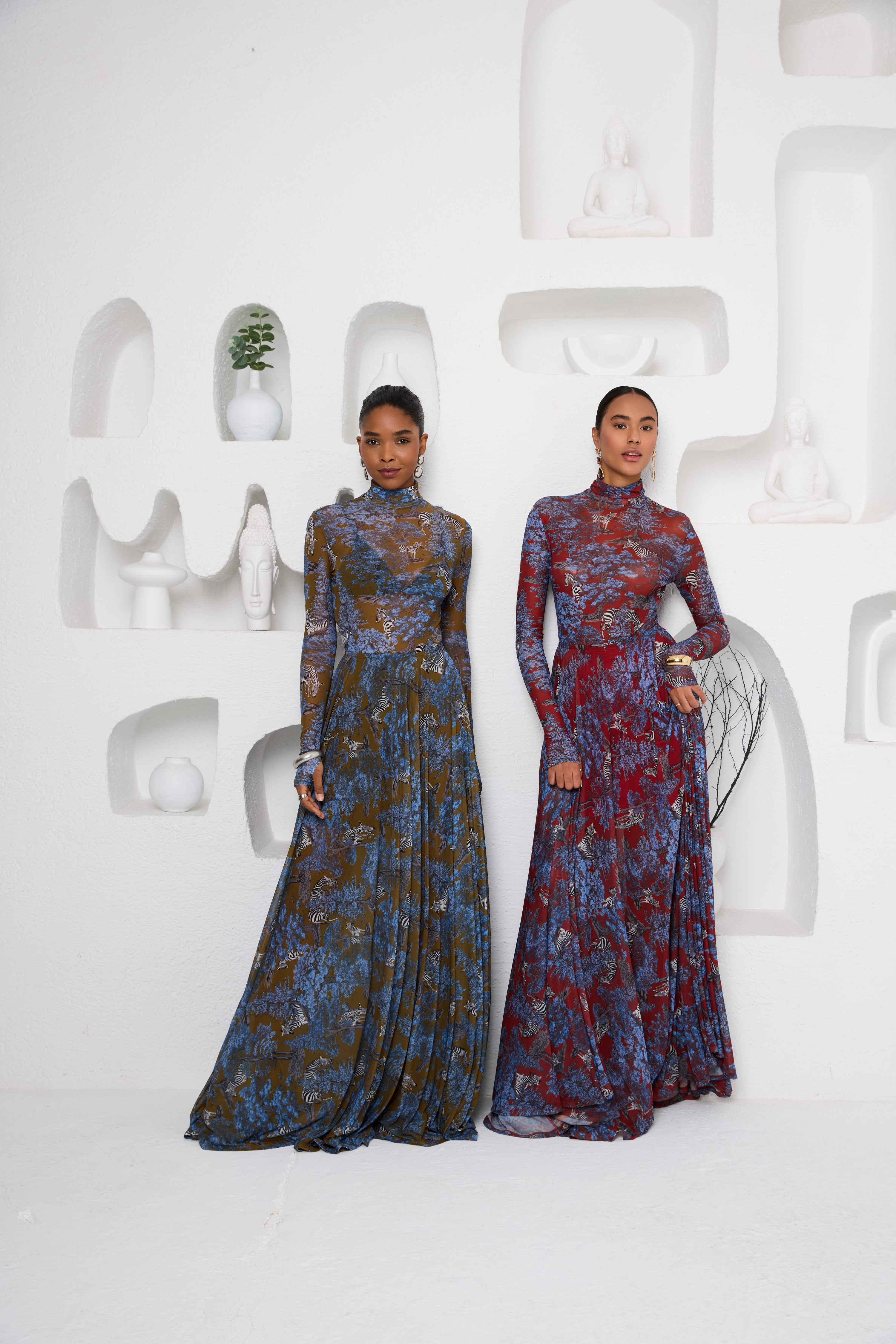 The Dream Safari Set is a two-piece showstopper crafted from our signature 4-way stretch mesh. Featuring a fitted bodysuit with thumbhole sleeves and a high-waisted, flowy skirt with an elastic waistband, this look blends comfort with effortless drama. The skirt is fully lined for coverage, while the bodysuit remains sheer for styling versatility. Adorned in our original Dream Safari print, an imaginative take on untamed nature. It’s available in Crimson, Olive, and Earth Brown. Wear your story. Wear Biageli. Recommend: XS/S (US Size 4-6), M/L(US 8-10), L/XL (US 12-14). Skirt Length: 123 cm long across