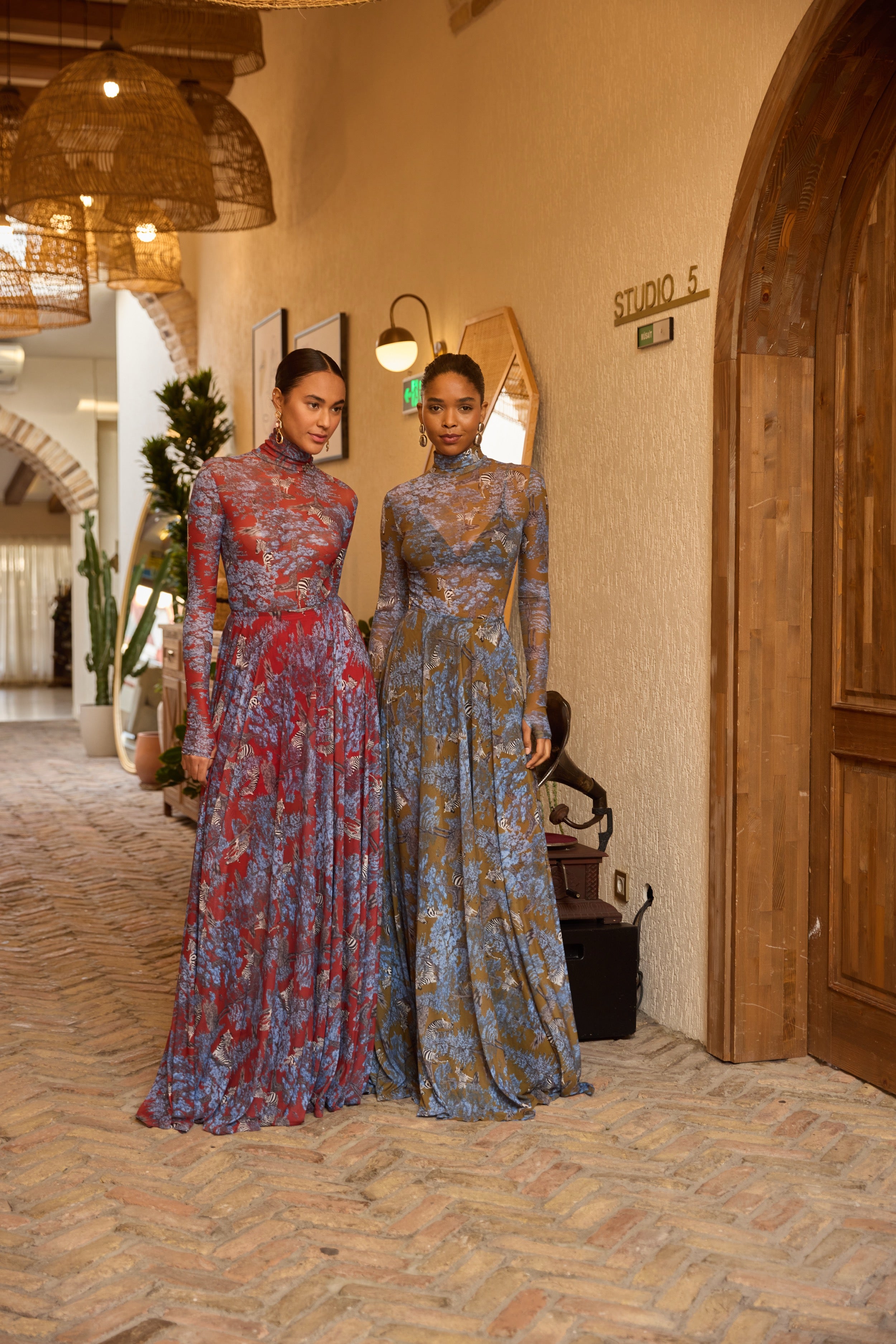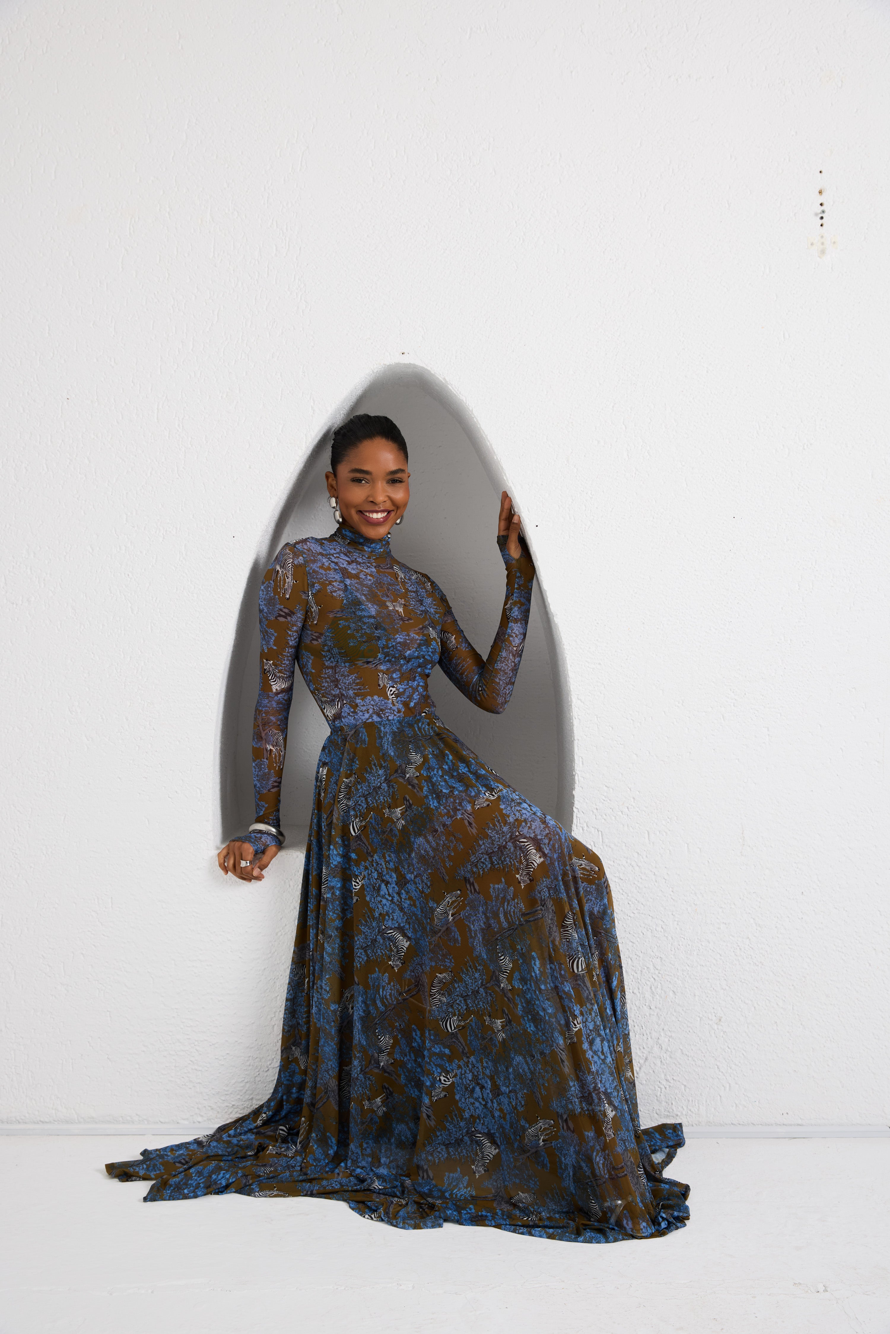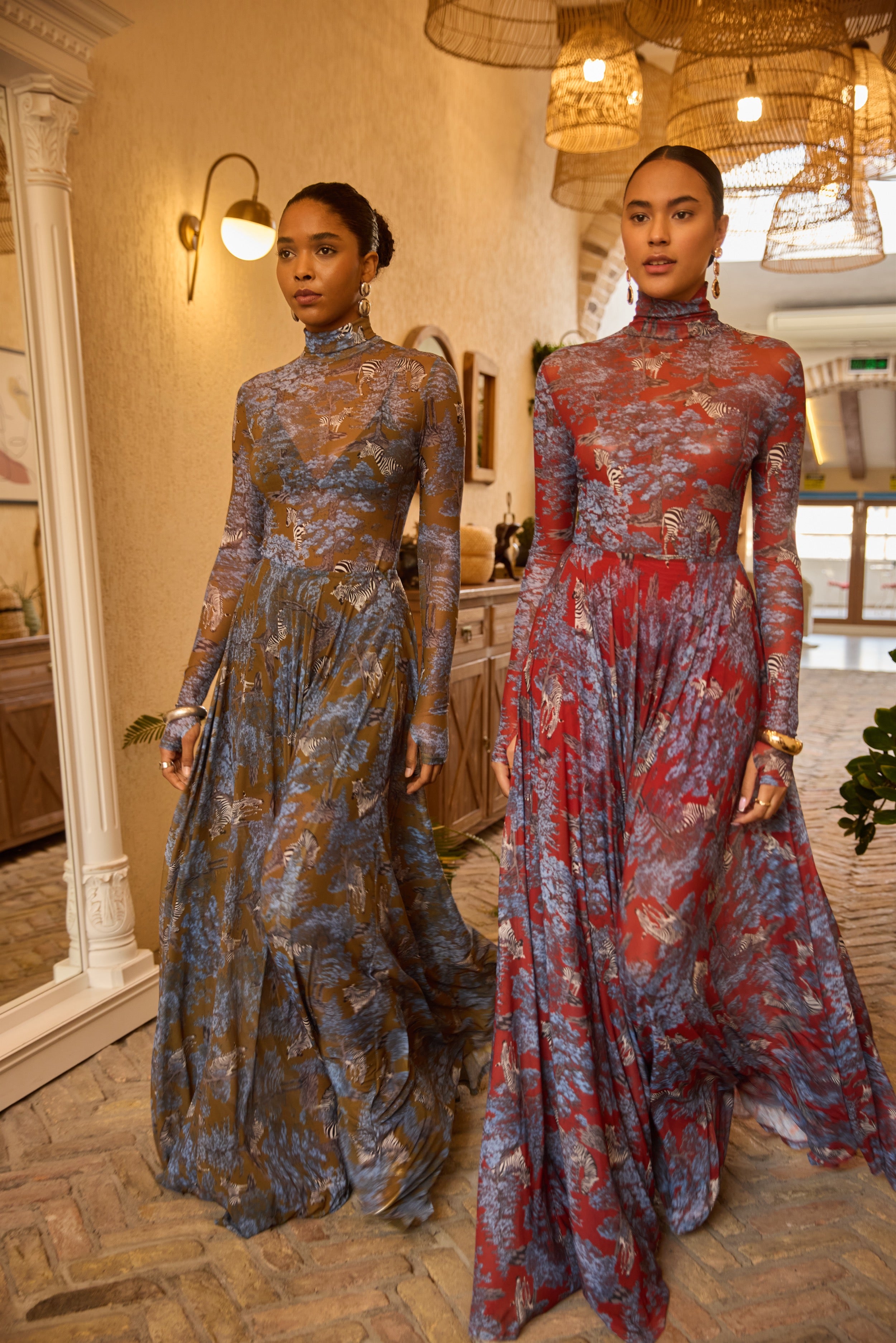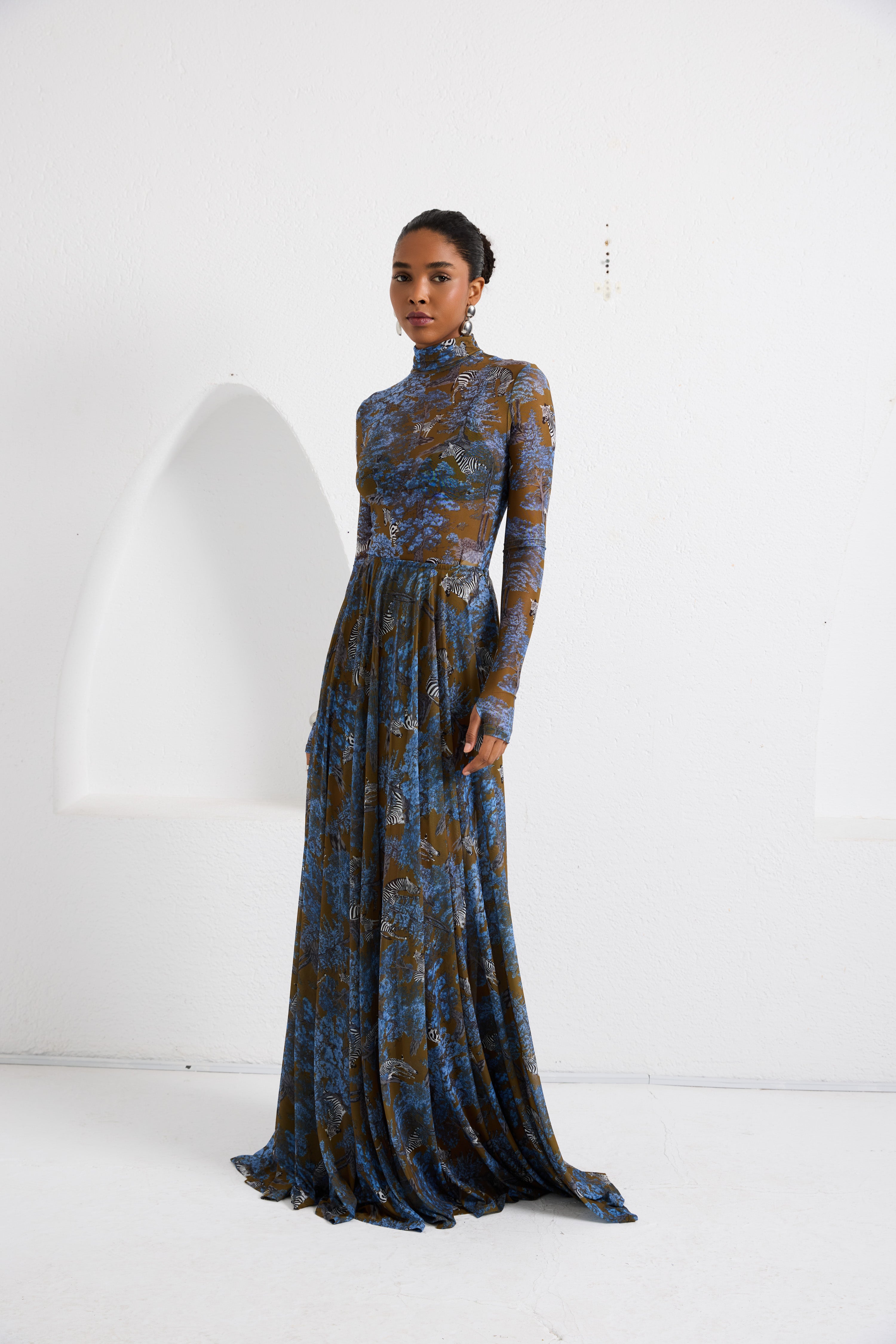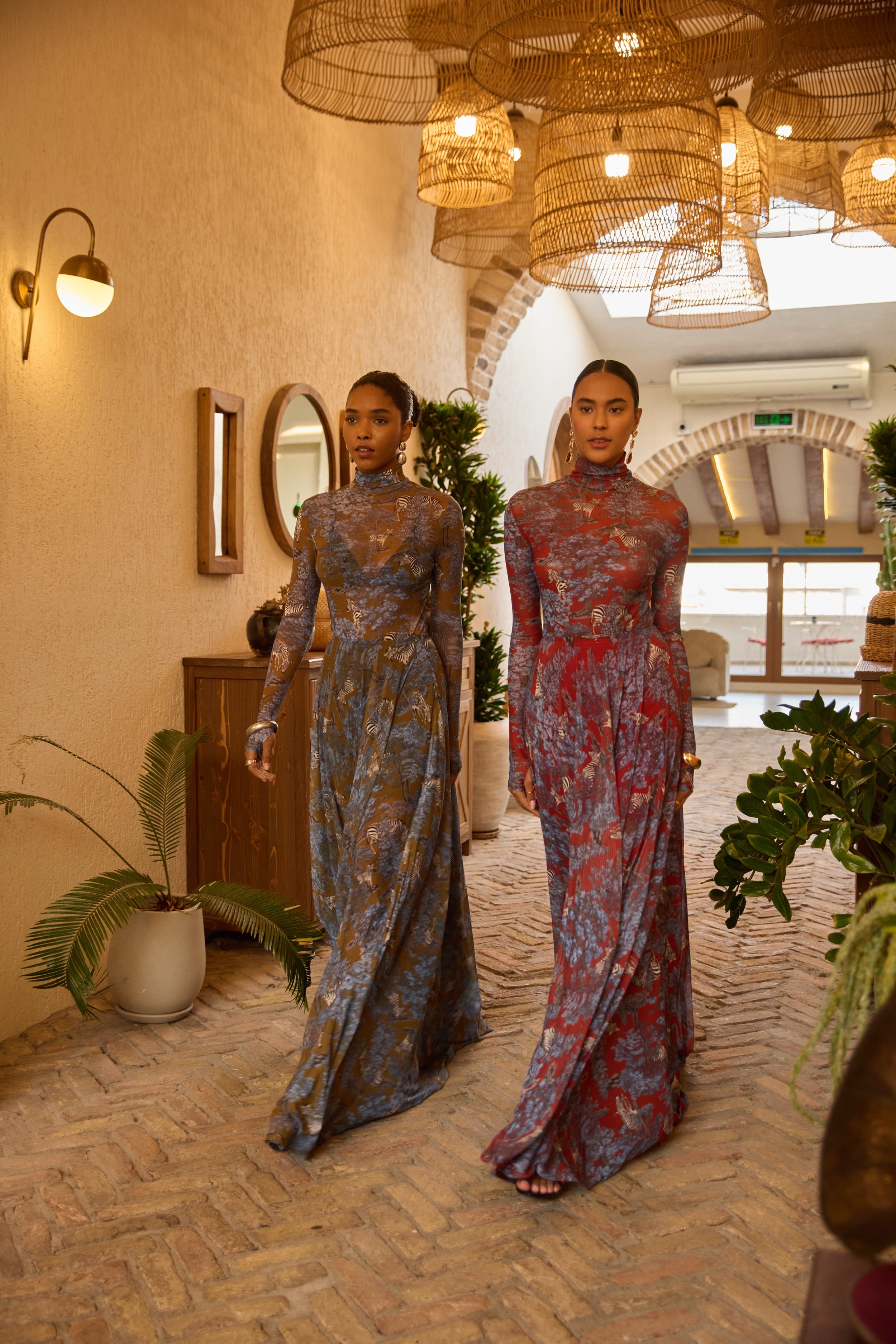 The Dream Safari Set is a two-piece showstopper crafted from our signature 4-way stretch mesh. Featuring a fitted bodysuit with thumbhole sleeves and a high-waisted, flowy skirt with an elastic waistband, this look blends comfort with effortless drama. The skirt is fully lined for coverage, while the bodysuit remains sheer for styling versatility. Adorned in our original Dream Safari print, an imaginative take on untamed nature. It’s available in Crimson, Olive, and Earth Brown. Wear your story. Wear Biageli. Recommend: XS/S (US Size 4-6), M/L(US 8-10), L/XL (US 12-14). Skirt Length: 123 cm long across