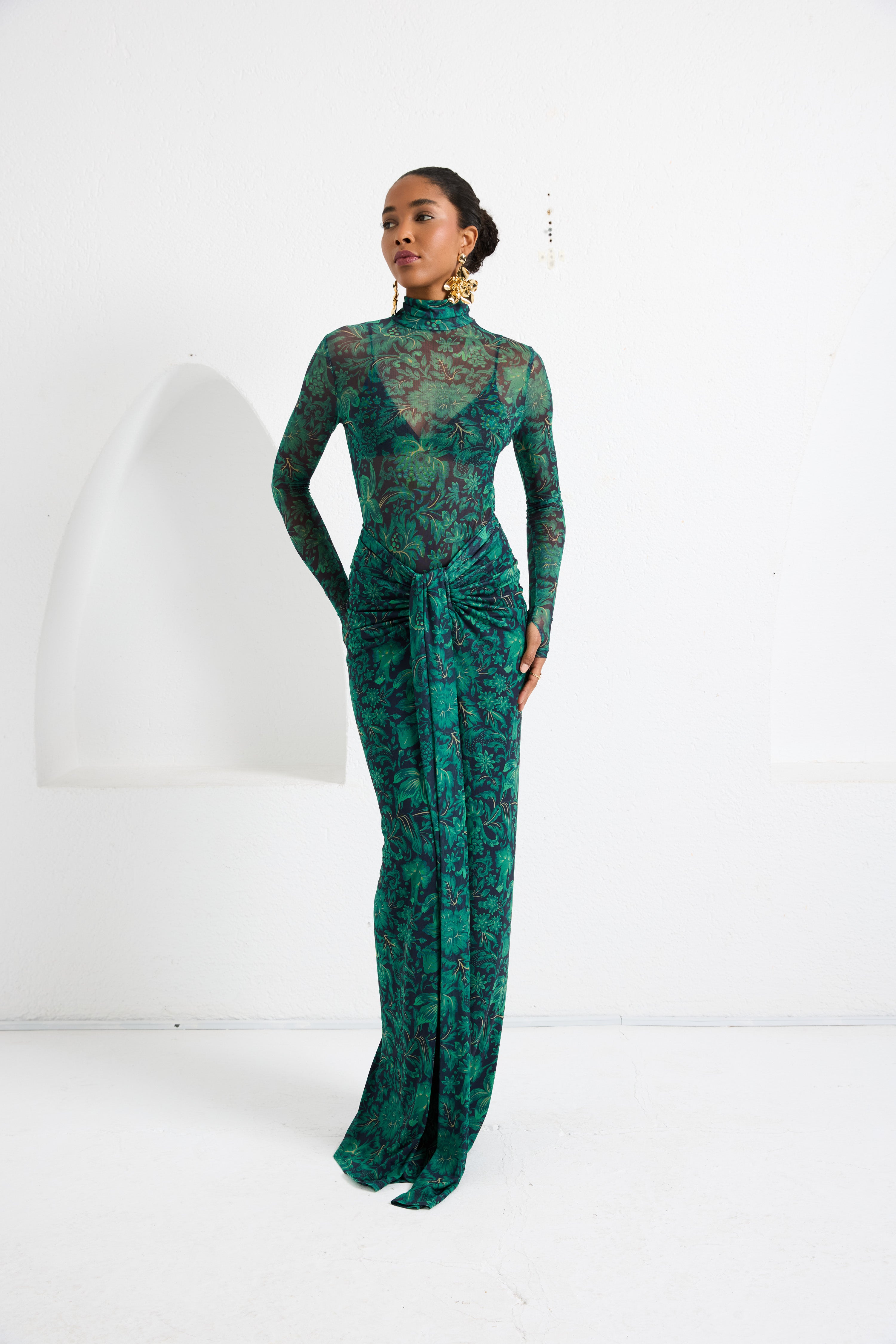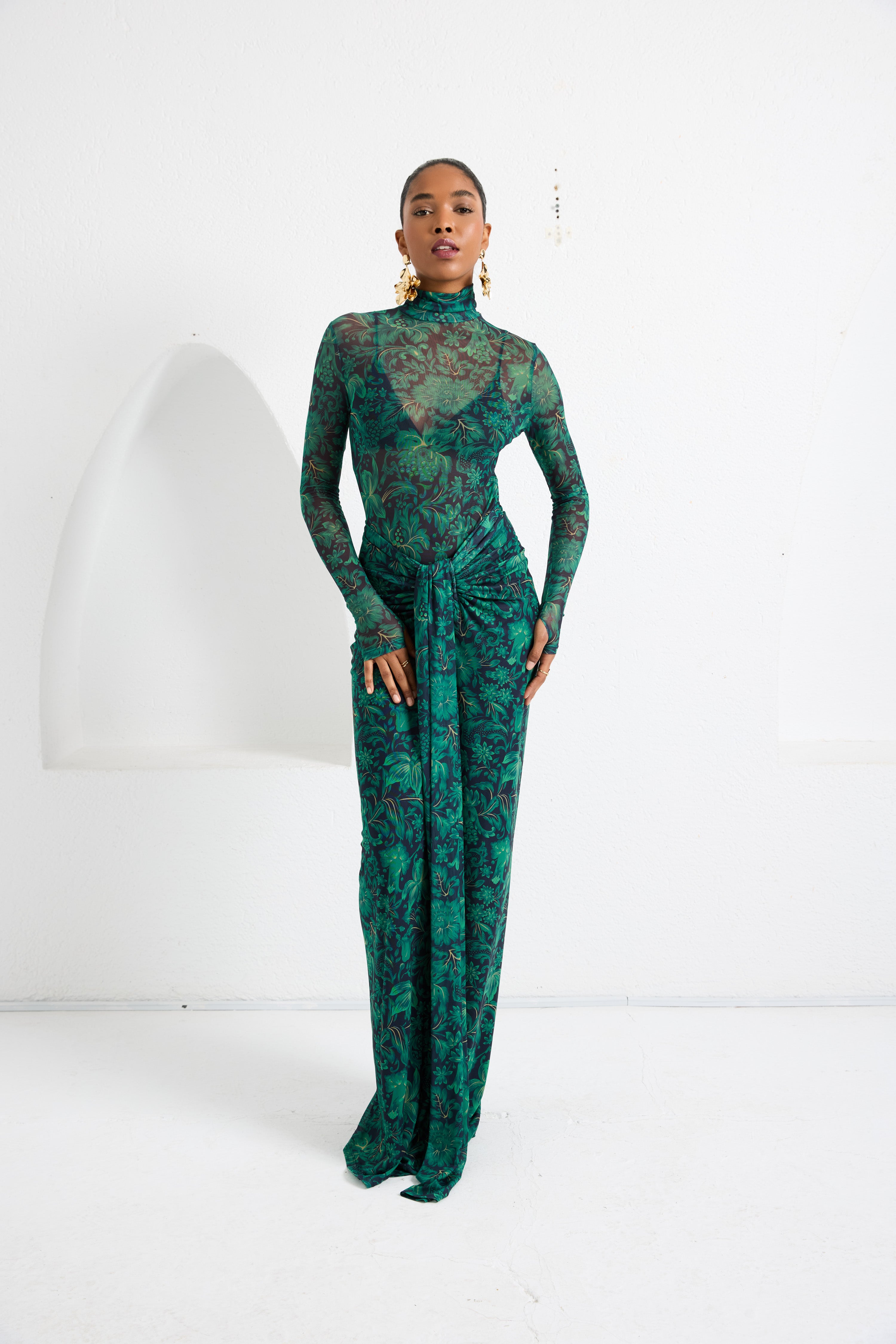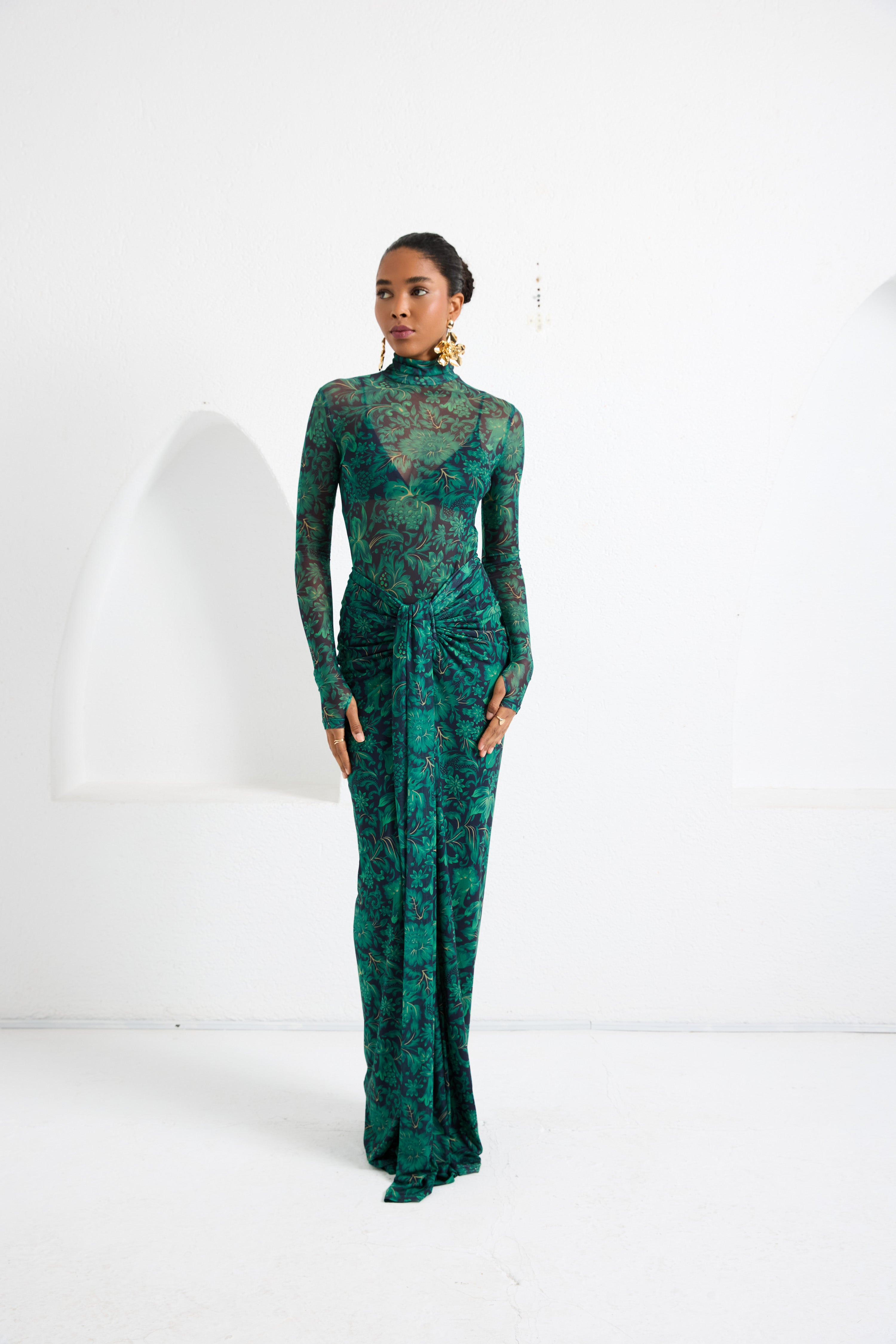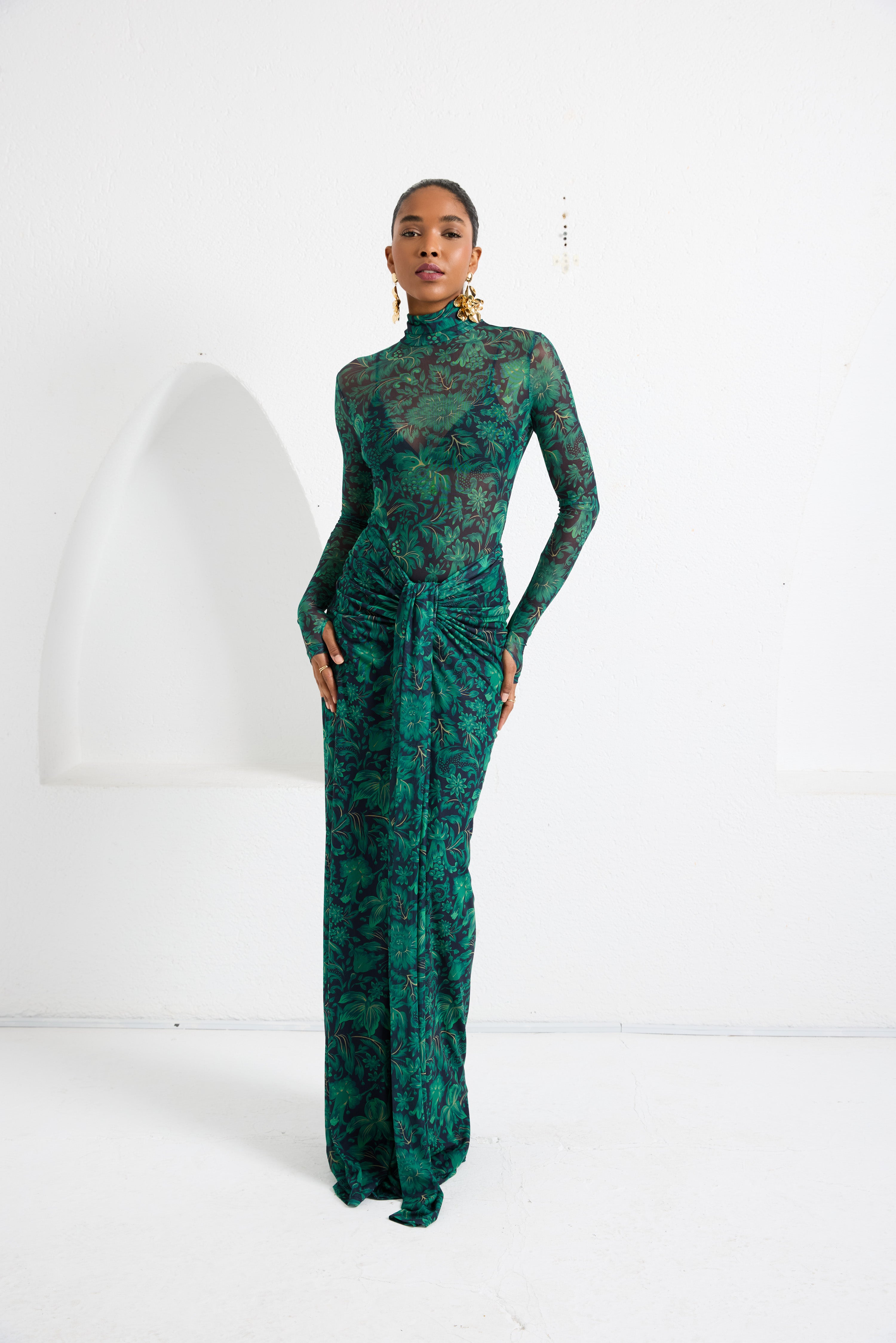 A second-skin bodysuit and ruched column skirt set crafted with a four way stretch sheer mesh, with a silhouette that clings then cascades, it blooms unapologetically, just like the woman it was made for. To drape and lock the skirt, find the black elastic loop on the outer part of the loose drape and hook it onto the button on the inside of the skirt near the zipper. Fabric: 4 Way Stretch Mesh (skirt is fully lined). Recommend: XS/S (US Size 4-6), M/L(US 8-10), L/XL (US 12-14). Skirt length is 127 cm for all sizes.