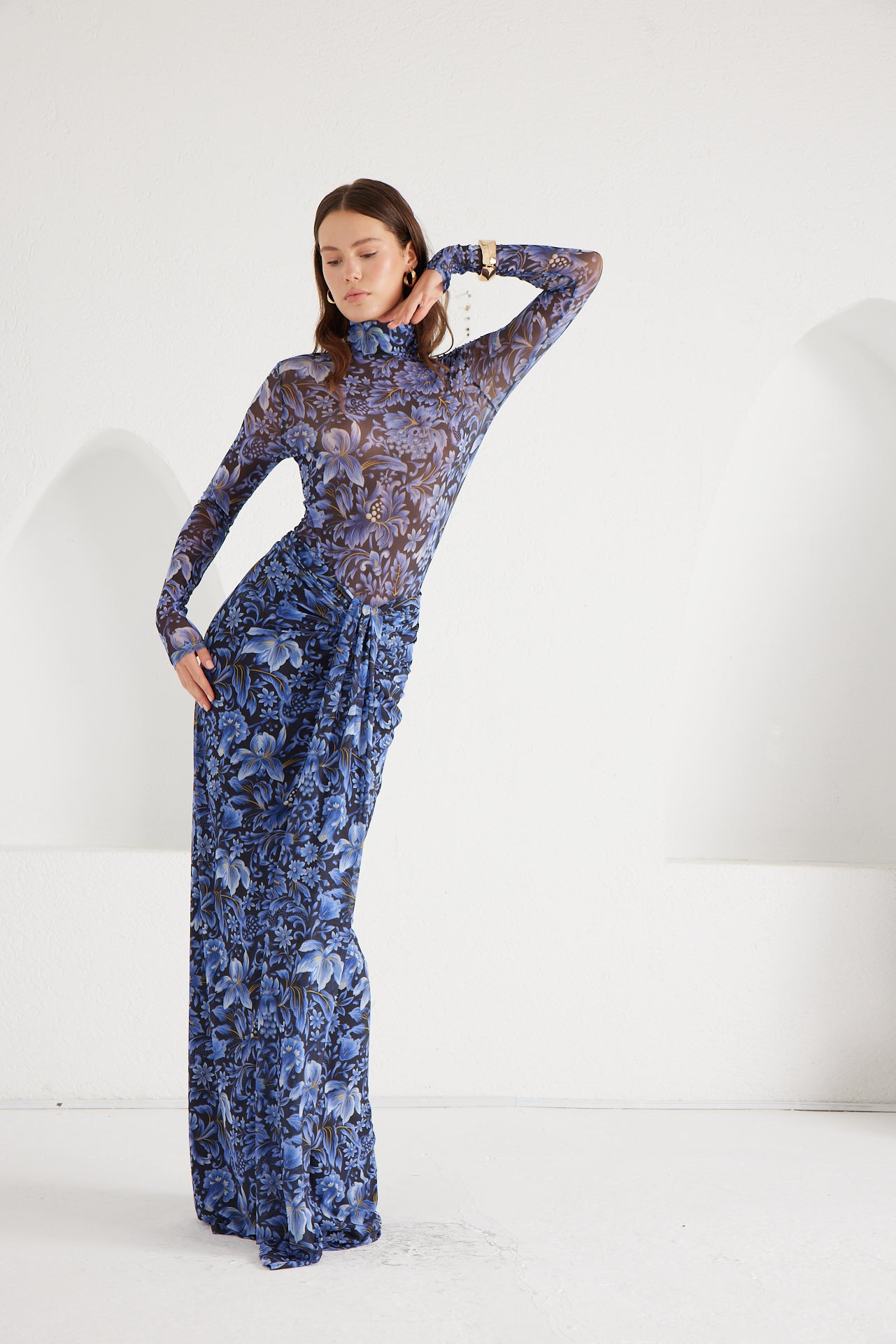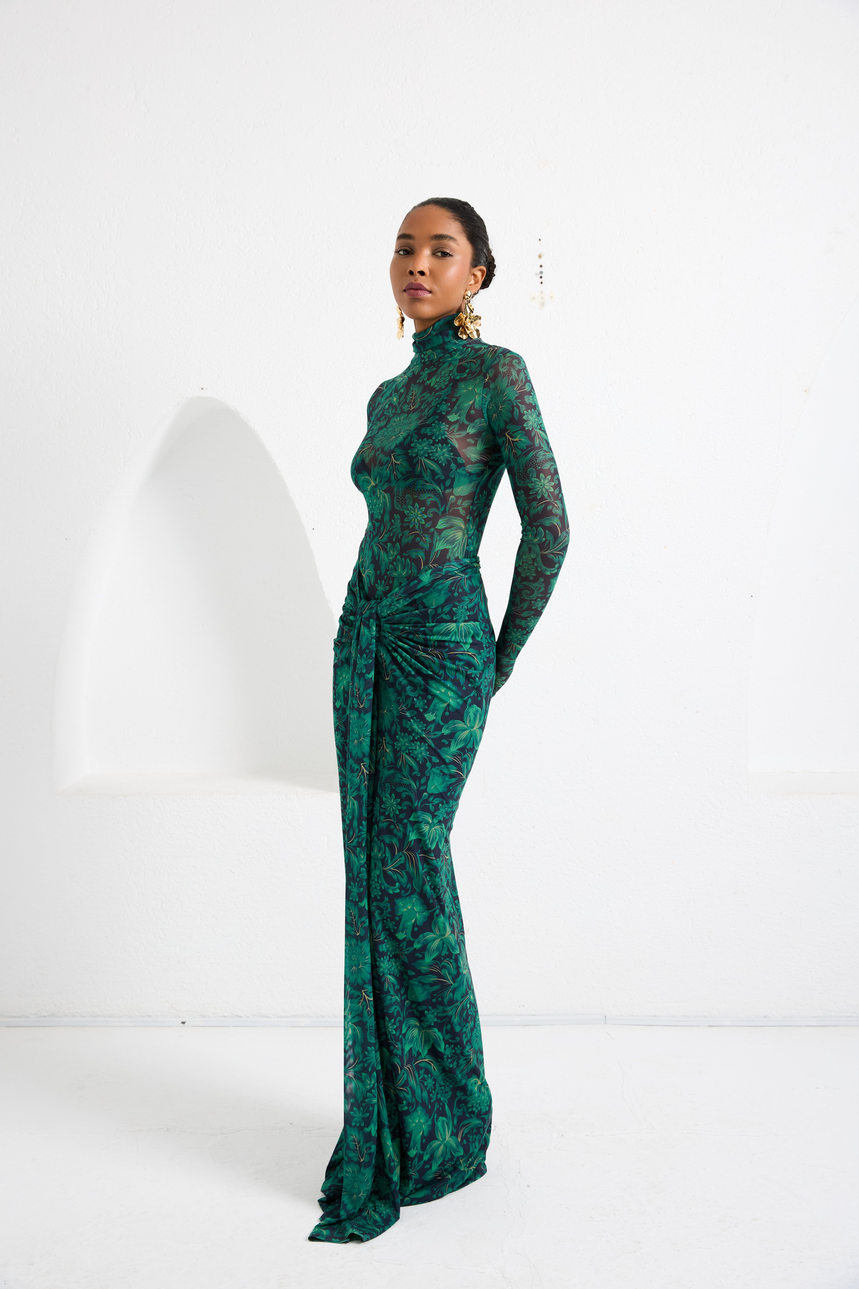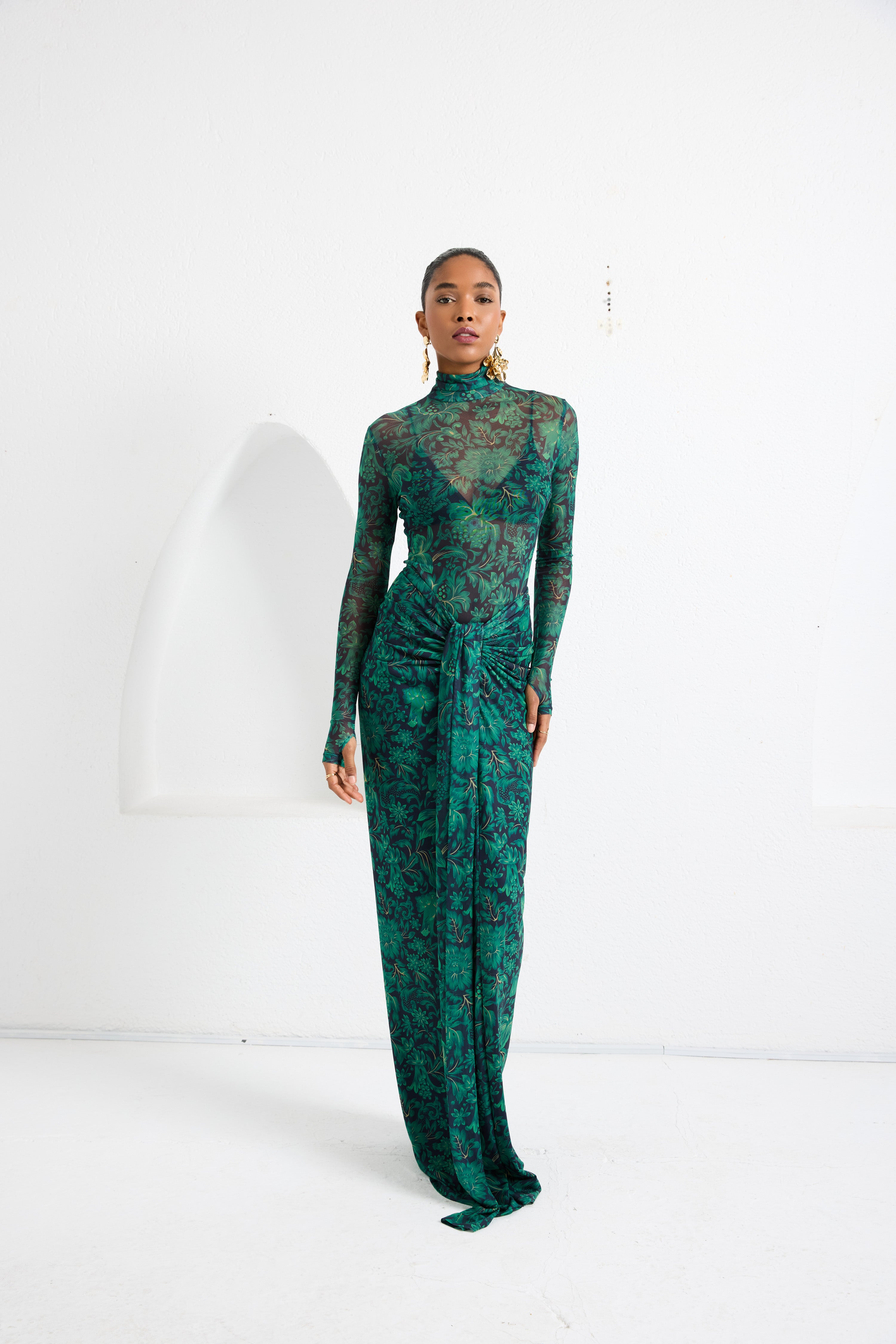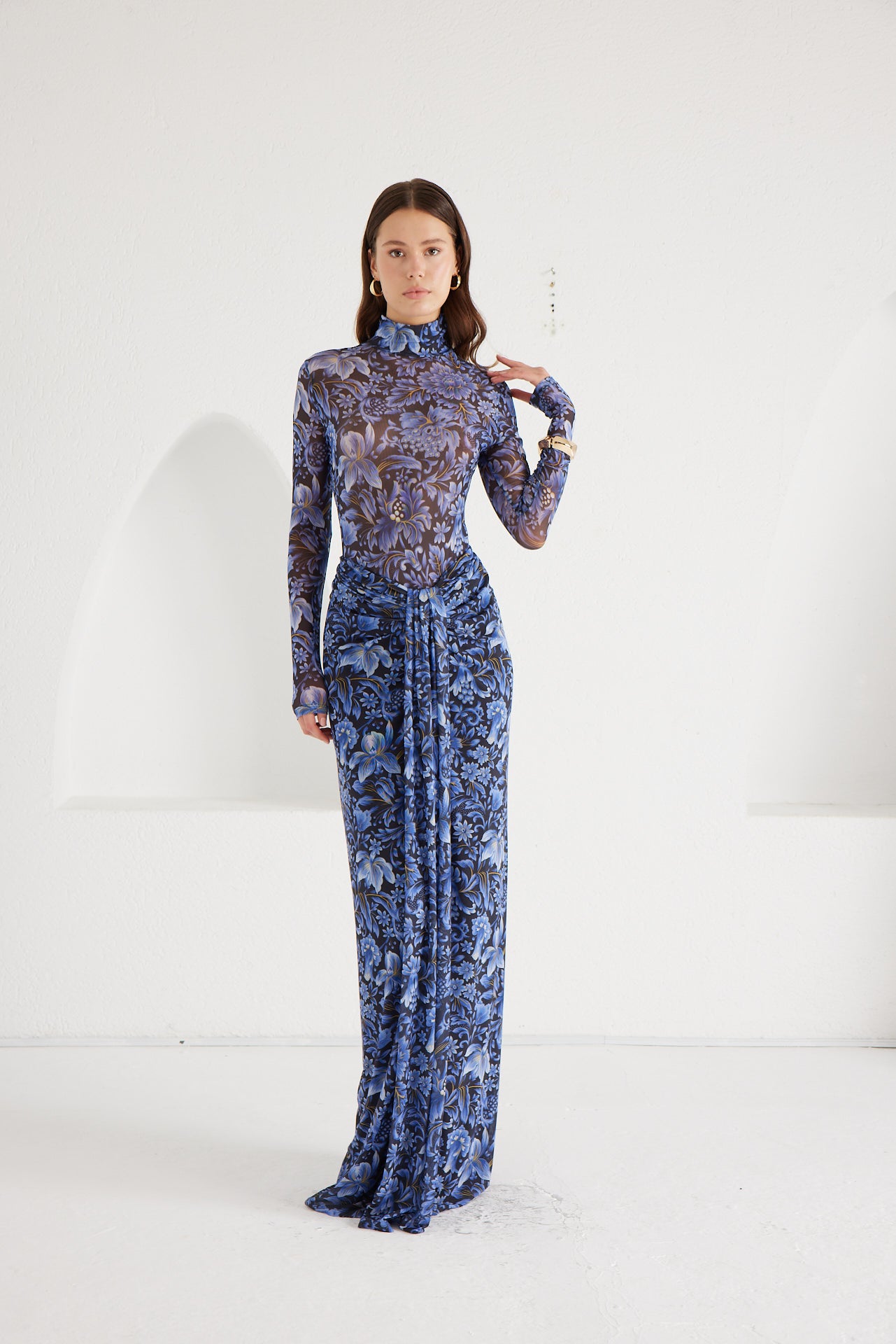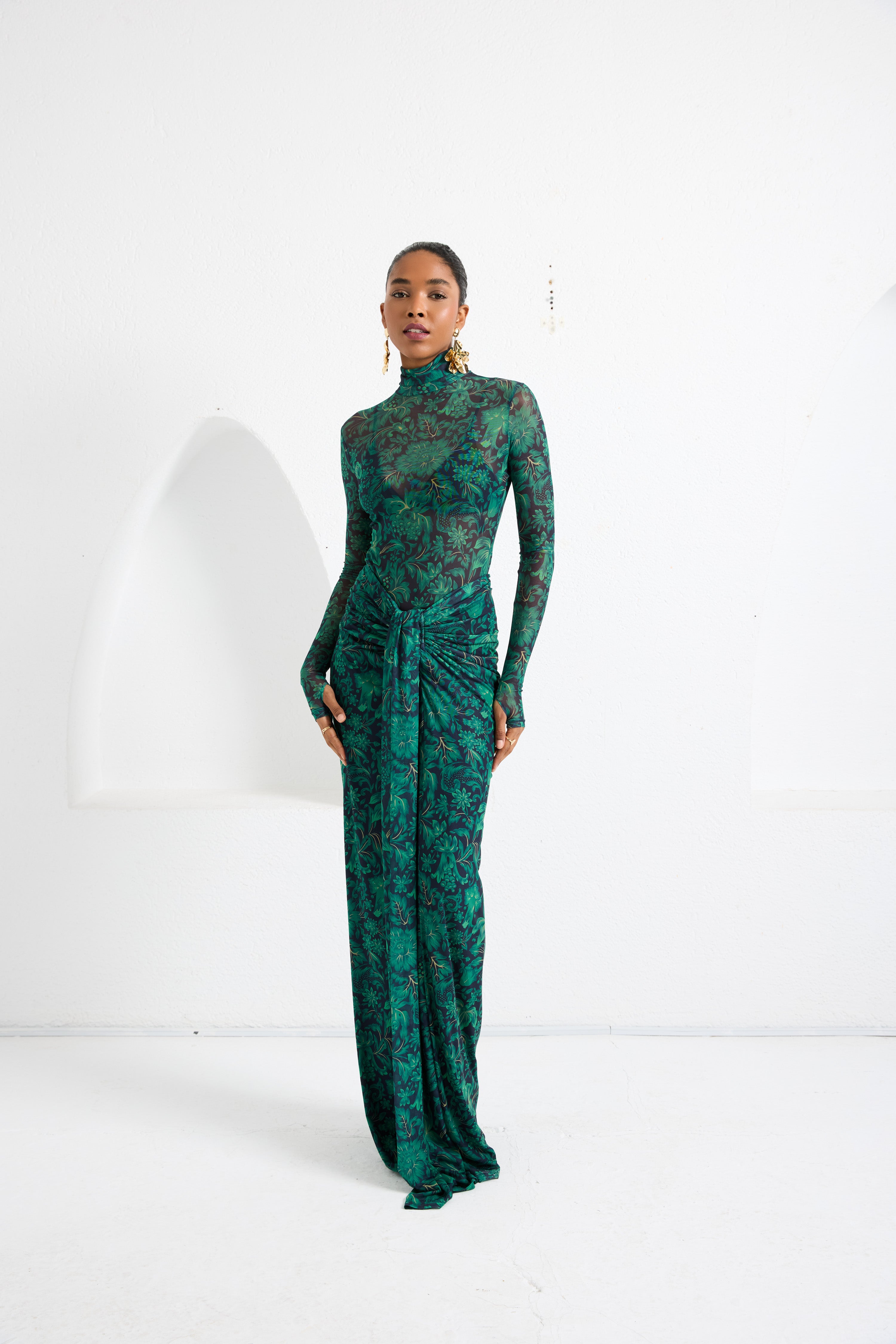 A second-skin bodysuit and ruched column skirt set crafted with a four way stretch sheer mesh, with a silhouette that clings then cascades, it blooms unapologetically, just like the woman it was made for. To drape and lock the skirt, find the black elastic loop on the outer part of the loose drape and hook it onto the button on the inside of the skirt near the zipper. Fabric: 4 Way Stretch Mesh (skirt is fully lined). Recommend: XS/S (US Size 4-6), M/L(US 8-10), L/XL (US 12-14). Skirt length is 127 cm for all sizes.