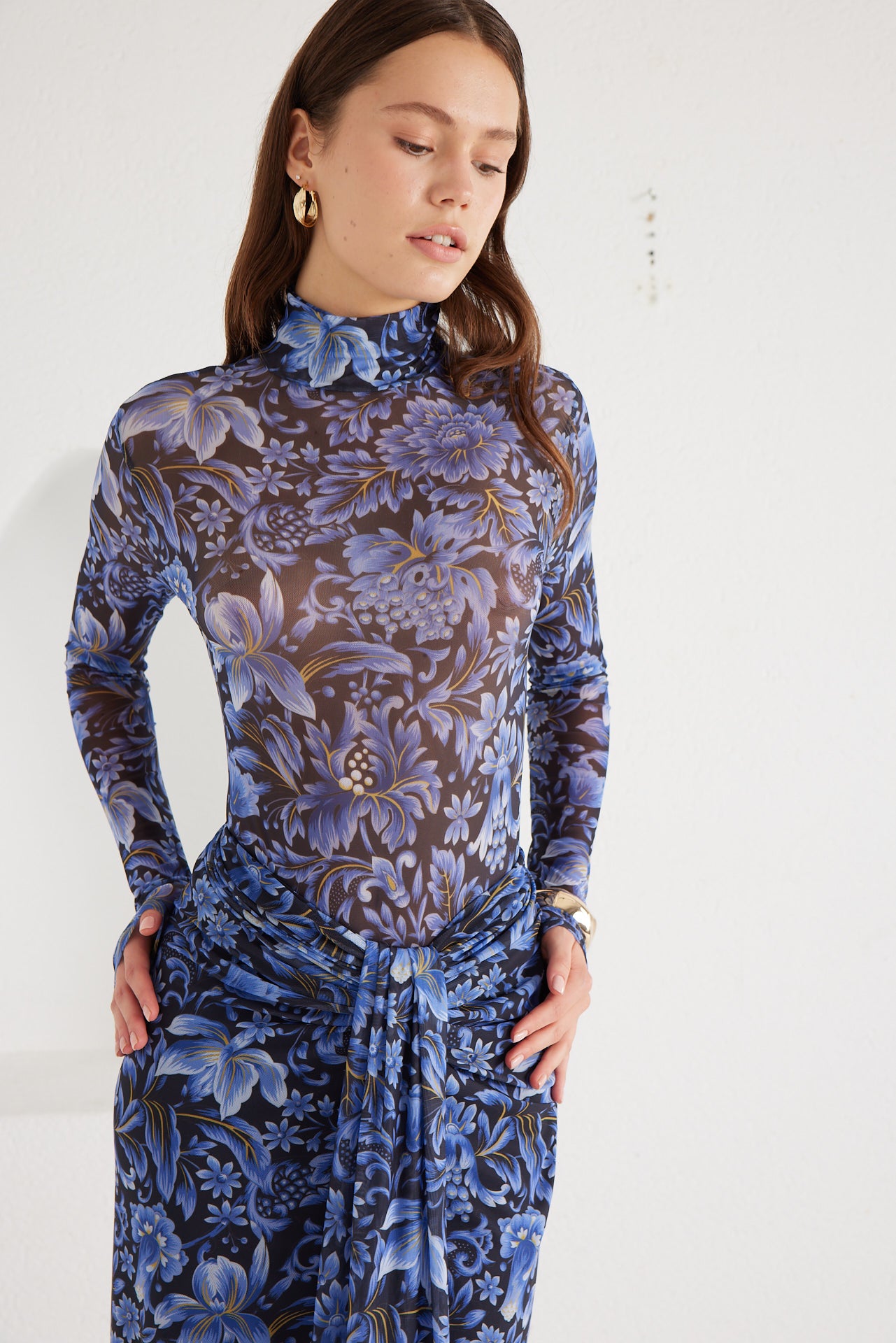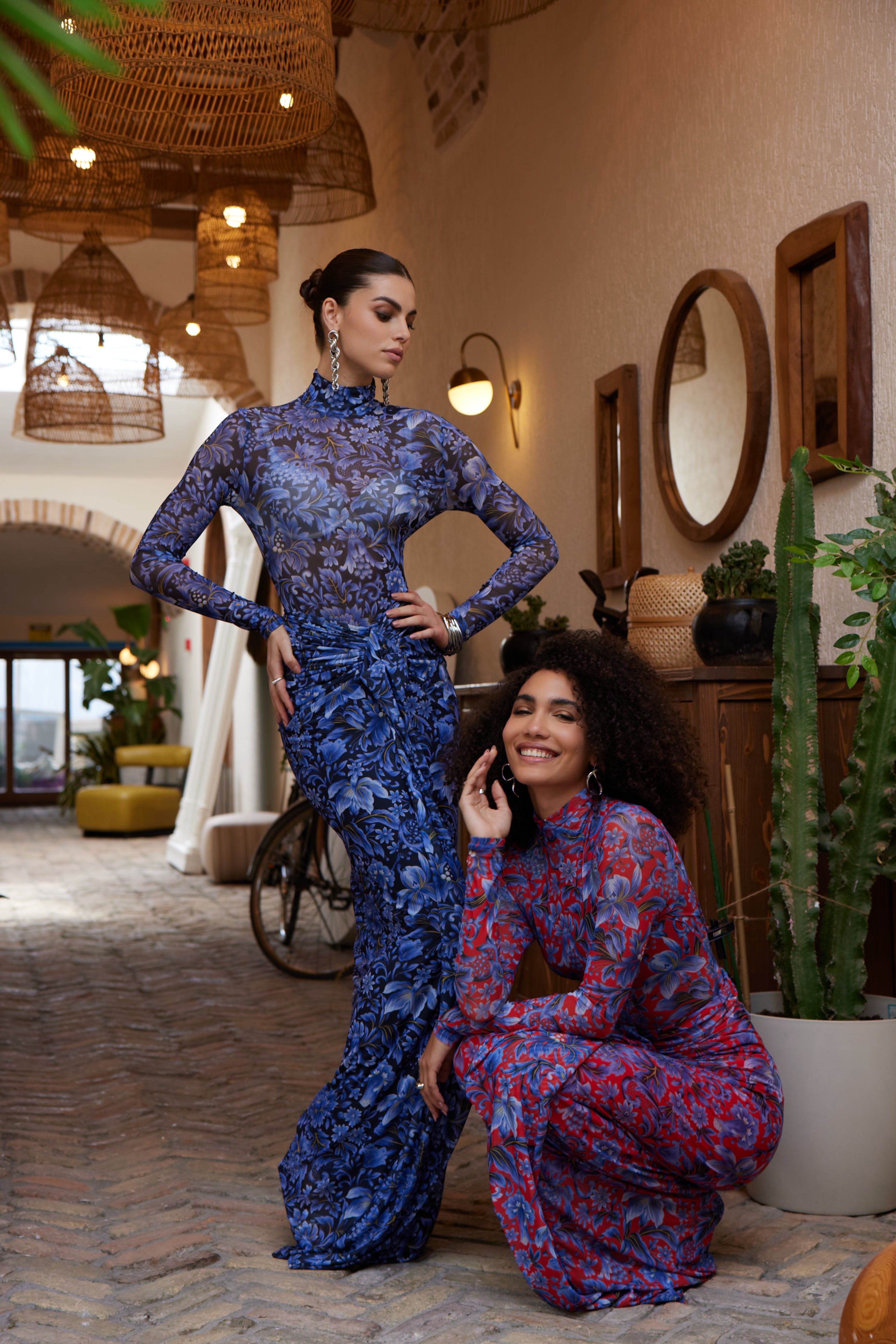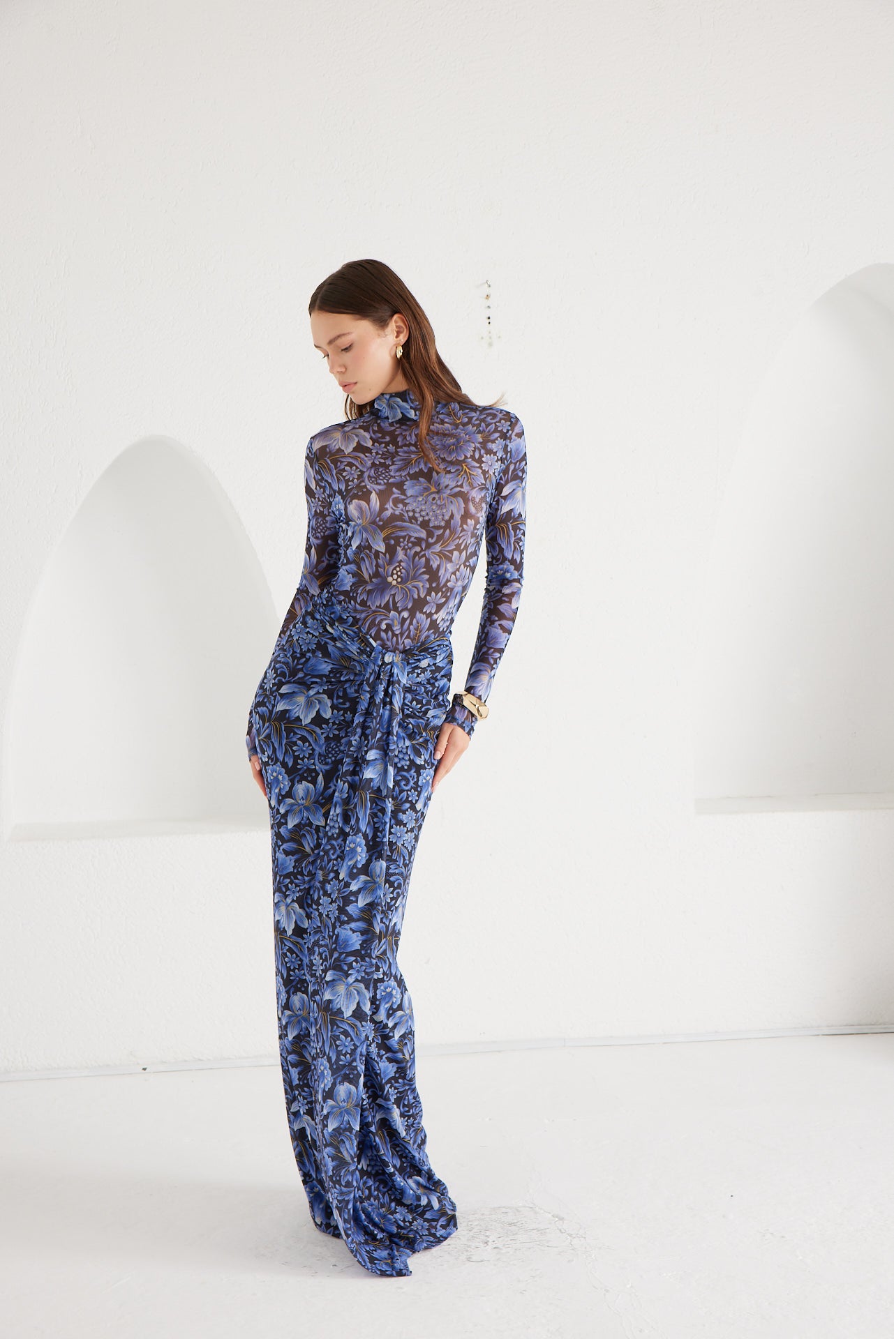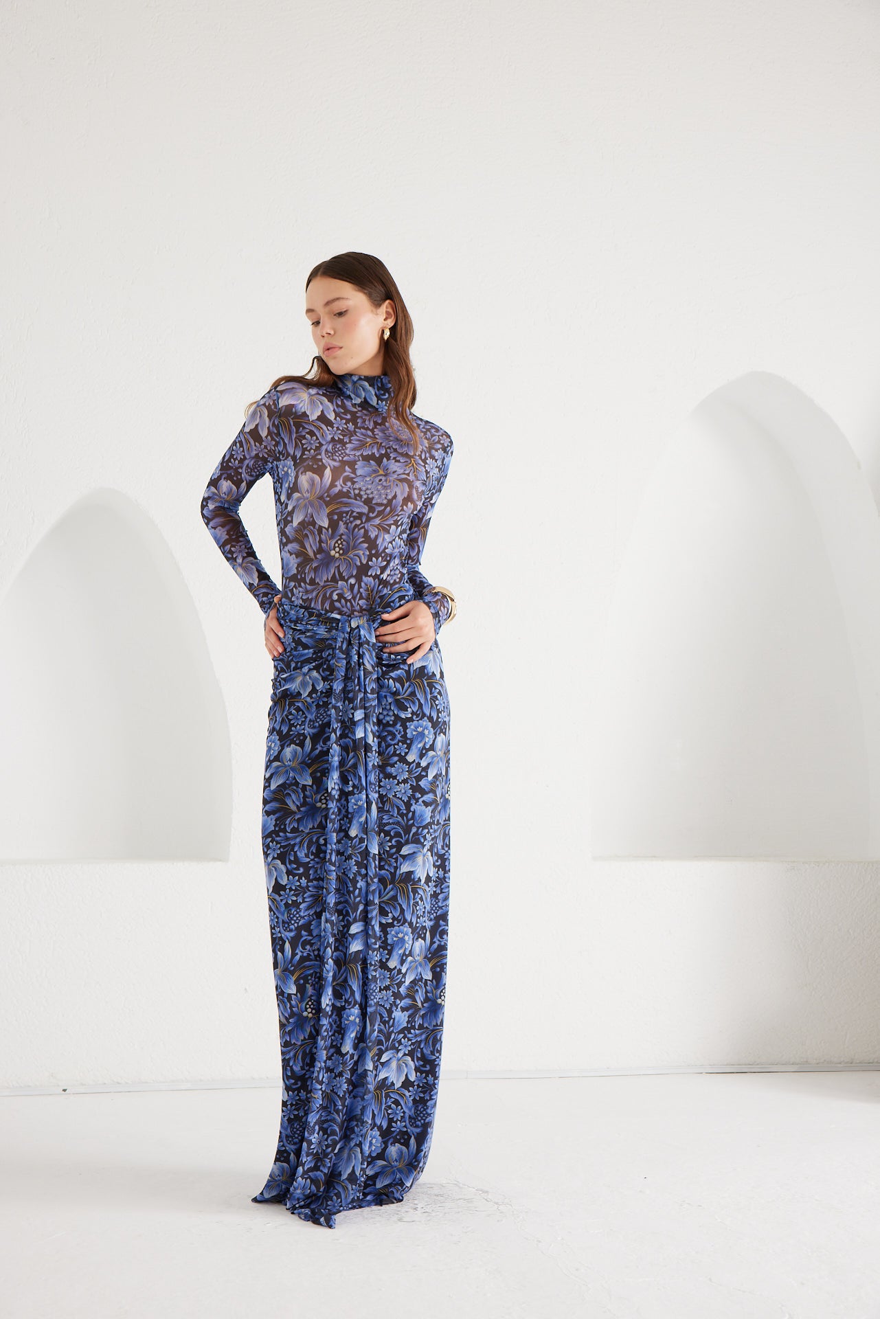 A second-skin bodysuit and ruched column skirt set crafted with a four way stretch sheer mesh, with a silhouette that clings then cascades, it blooms unapologetically, just like the woman it was made for. To drape and lock the skirt, find the black elastic loop on the outer part of the loose drape and hook it onto the button on the inside of the skirt near the zipper. Fabric: 4 Way Stretch Mesh (skirt is fully lined). Recommend: XS/S (US Size 4-6), M/L(US 8-10), L/XL (US 12-14). Skirt length is 127 cm for all sizes.