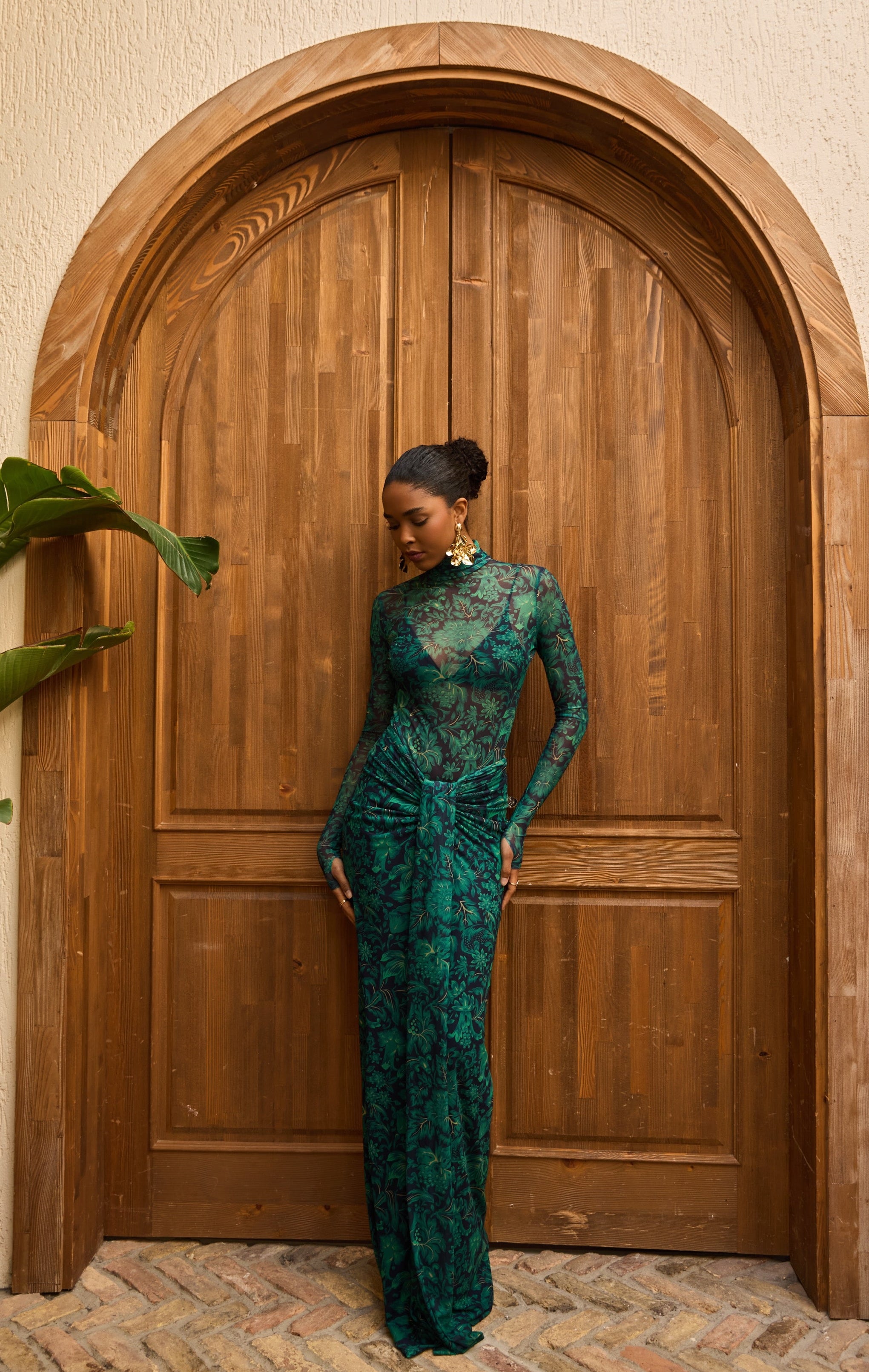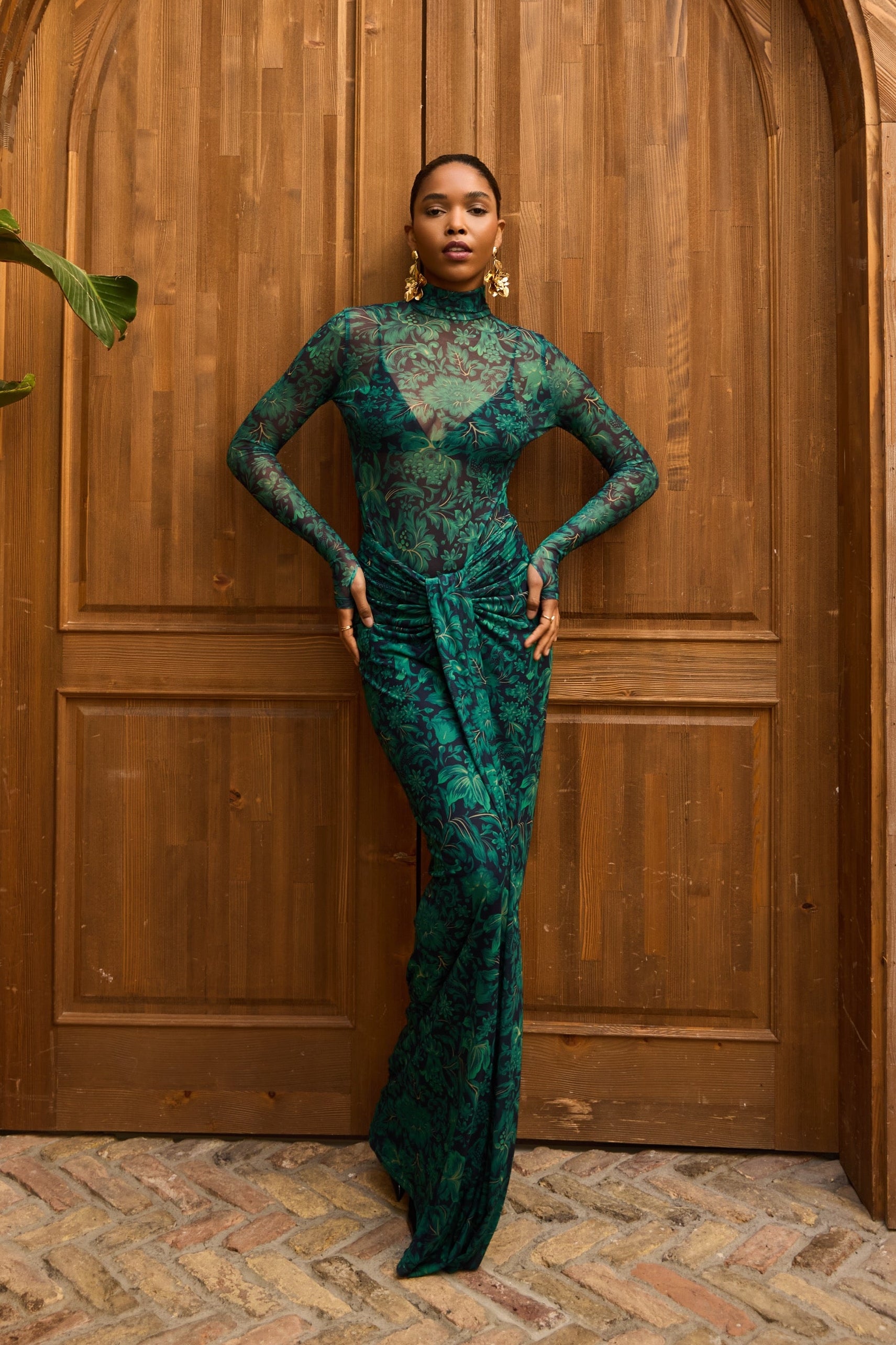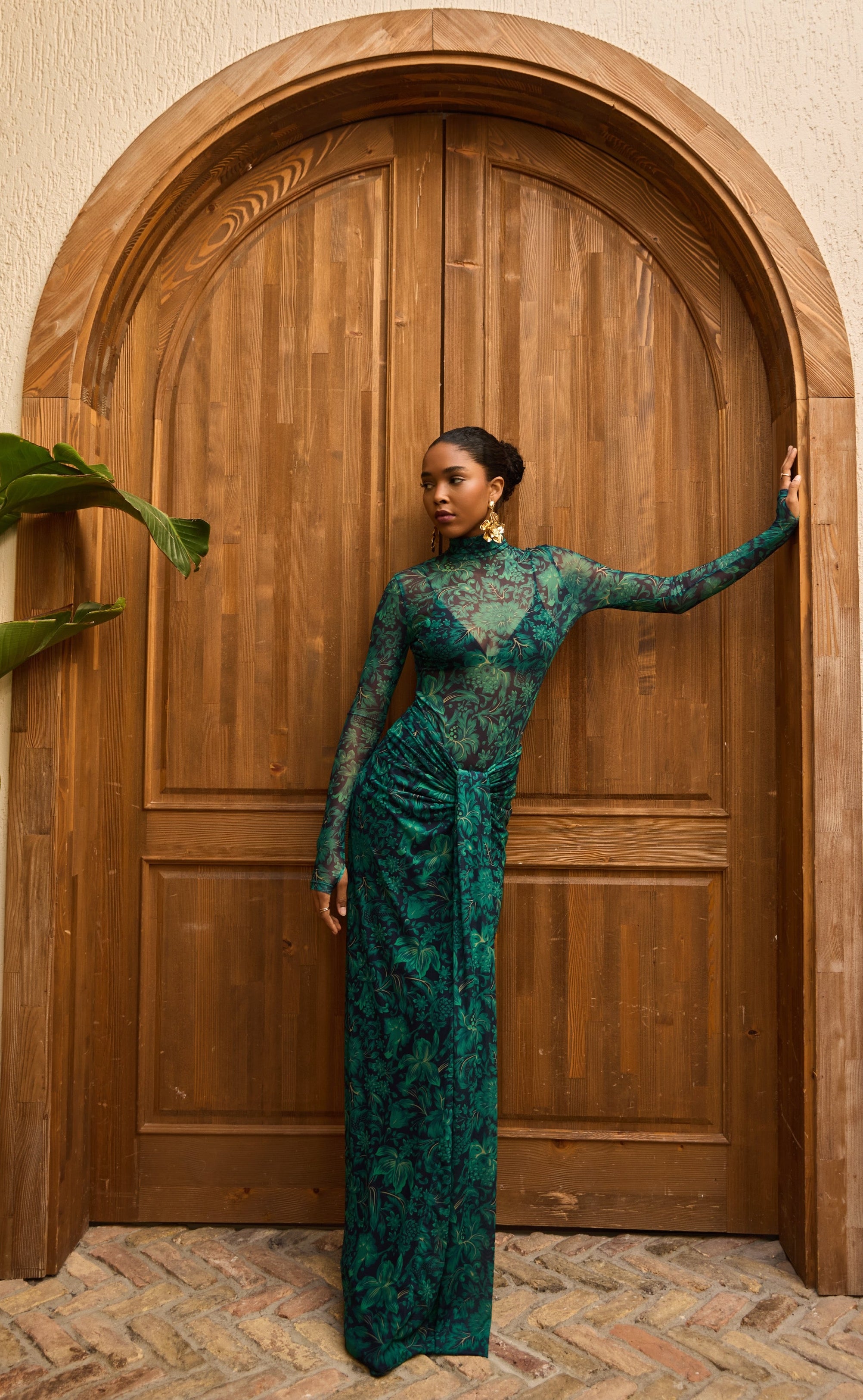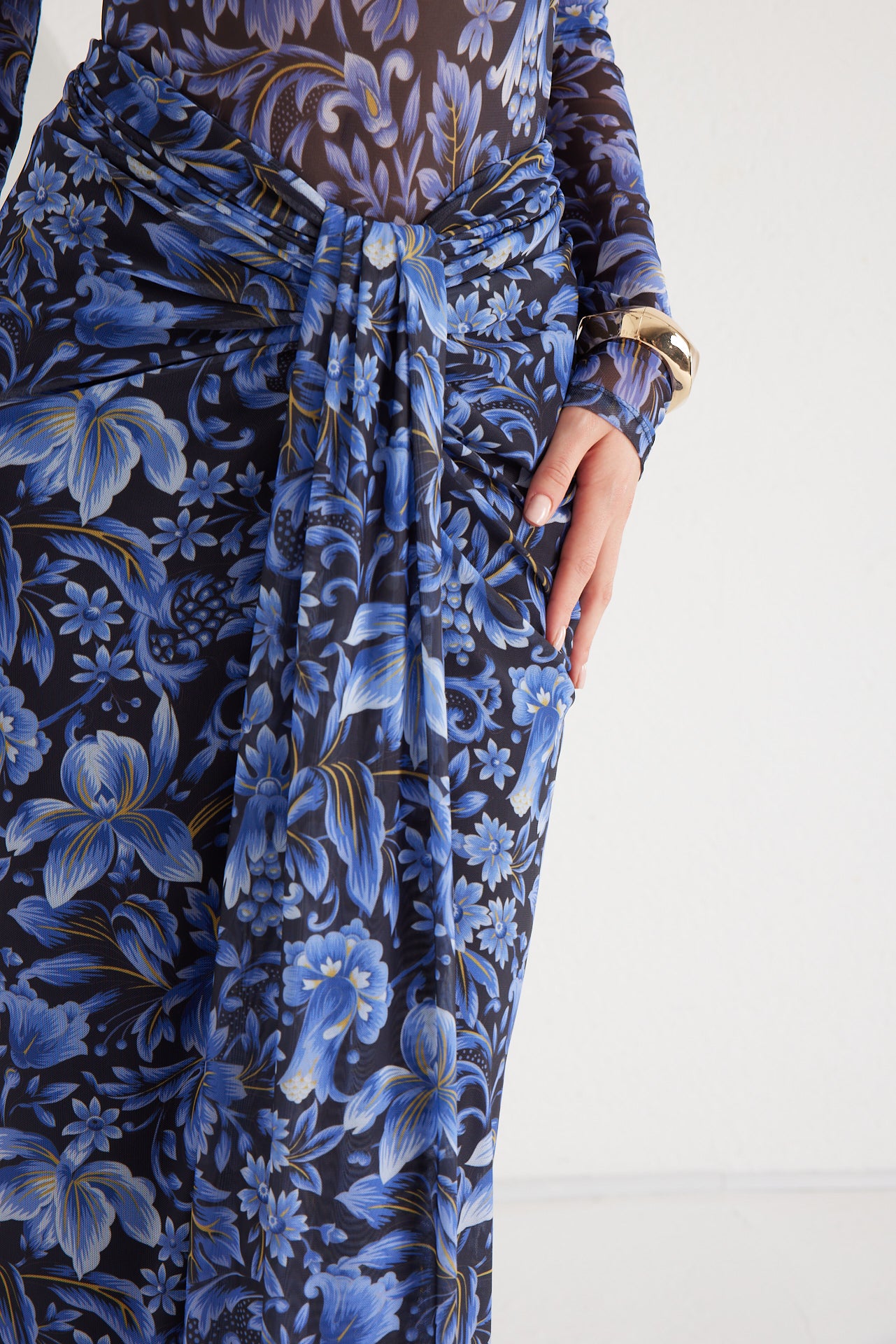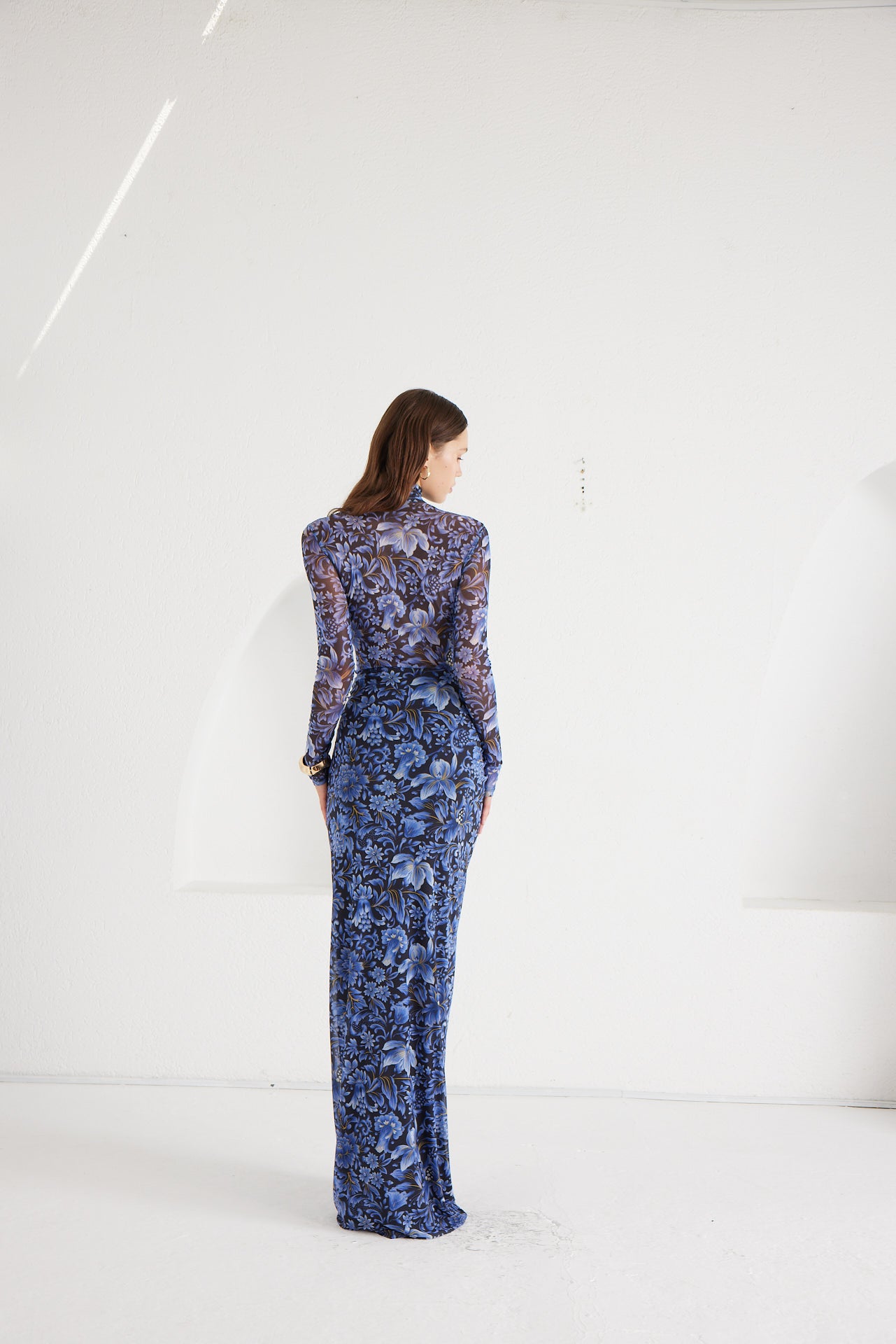 A second-skin bodysuit and ruched column skirt set crafted with a four way stretch sheer mesh, with a silhouette that clings then cascades, it blooms unapologetically, just like the woman it was made for. To drape and lock the skirt, find the black elastic loop on the outer part of the loose drape and hook it onto the button on the inside of the skirt near the zipper. Fabric: 4 Way Stretch Mesh (skirt is fully lined). Recommend: XS/S (US Size 4-6), M/L(US 8-10), L/XL (US 12-14). Skirt length is 127 cm for all sizes.