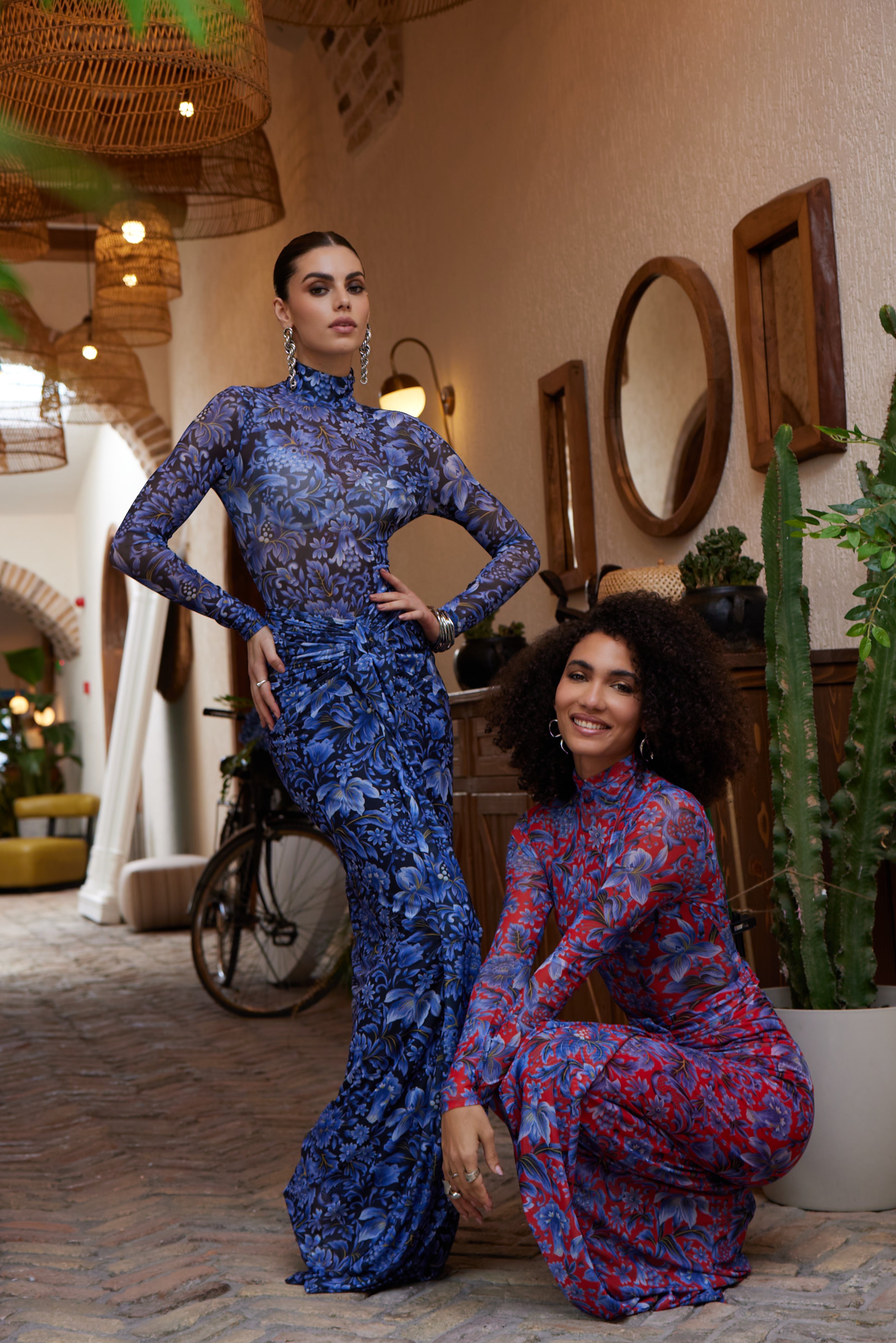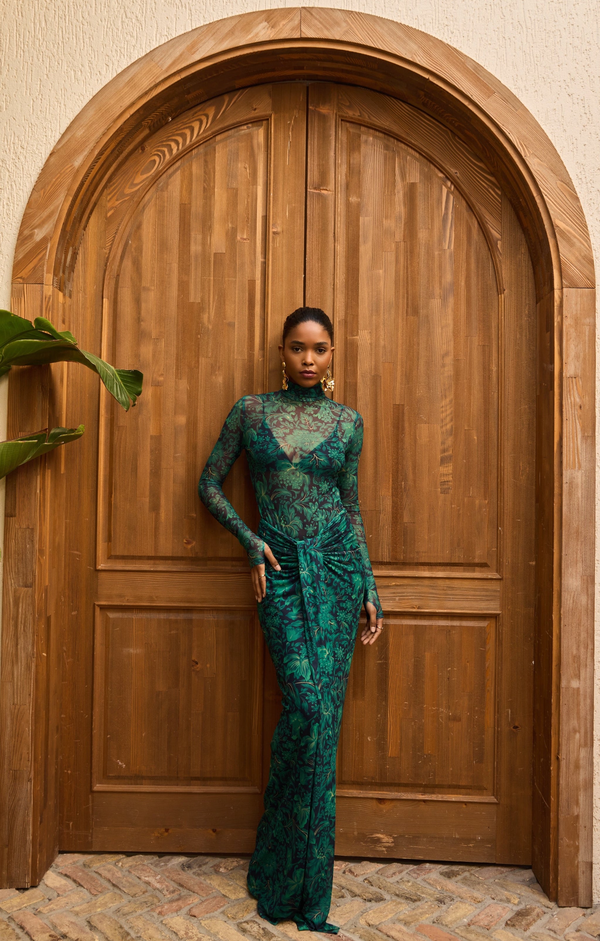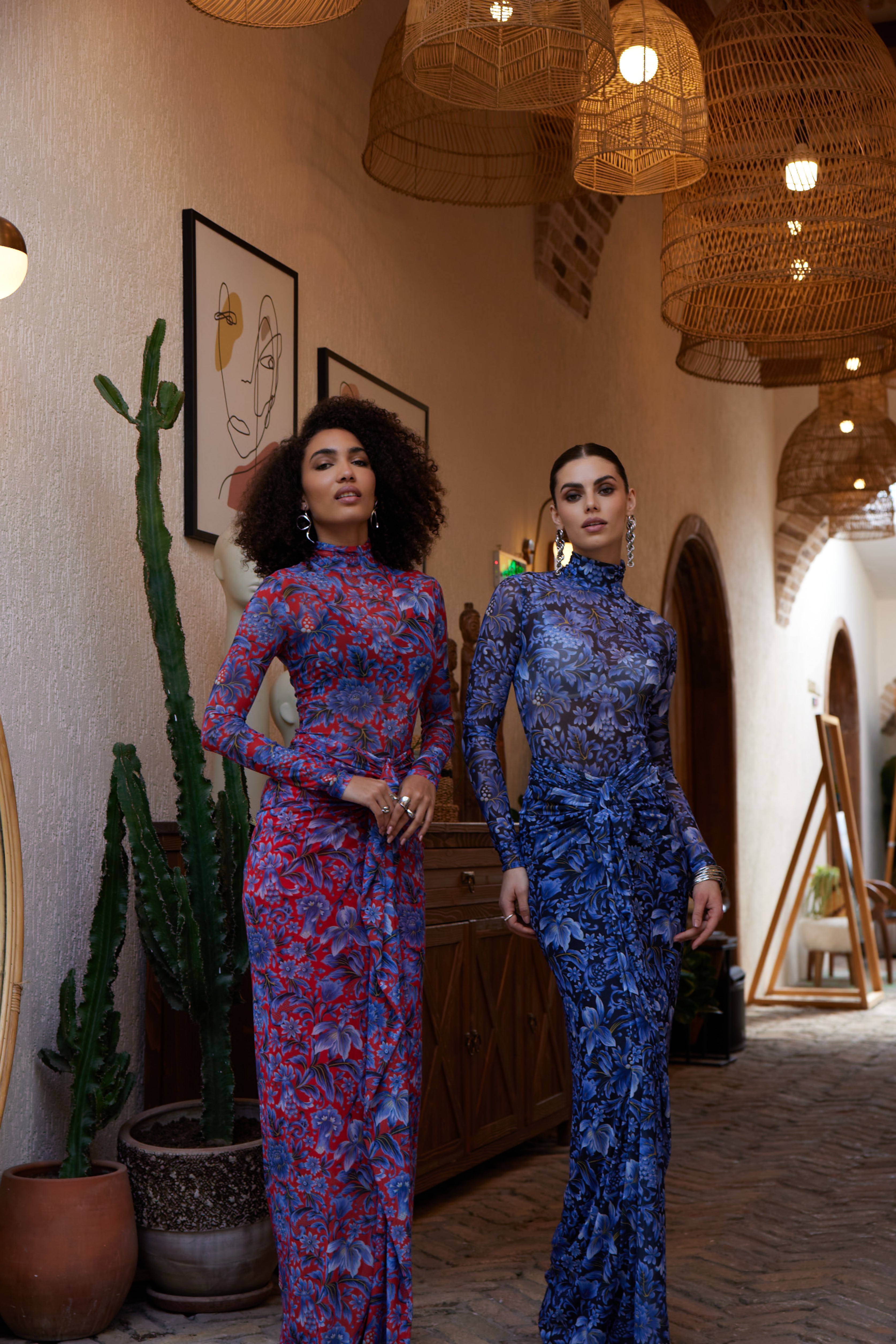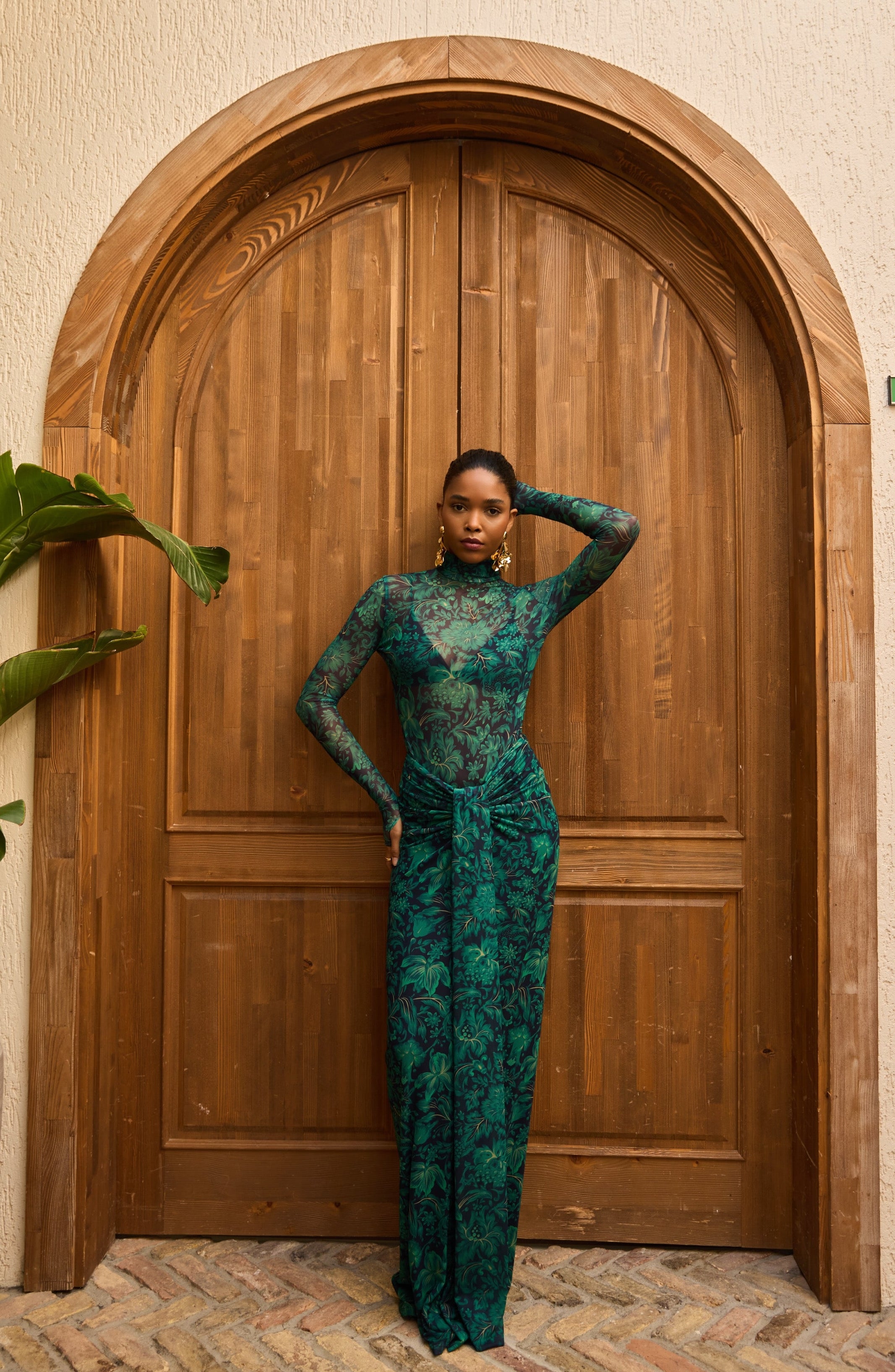 A second-skin bodysuit and ruched column skirt set crafted with a four way stretch sheer mesh, with a silhouette that clings then cascades, it blooms unapologetically, just like the woman it was made for. To drape and lock the skirt, find the black elastic loop on the outer part of the loose drape and hook it onto the button on the inside of the skirt near the zipper. Fabric: 4 Way Stretch Mesh (skirt is fully lined). Recommend: XS/S (US Size 4-6), M/L(US 8-10), L/XL (US 12-14). Skirt length is 127 cm for all sizes.
