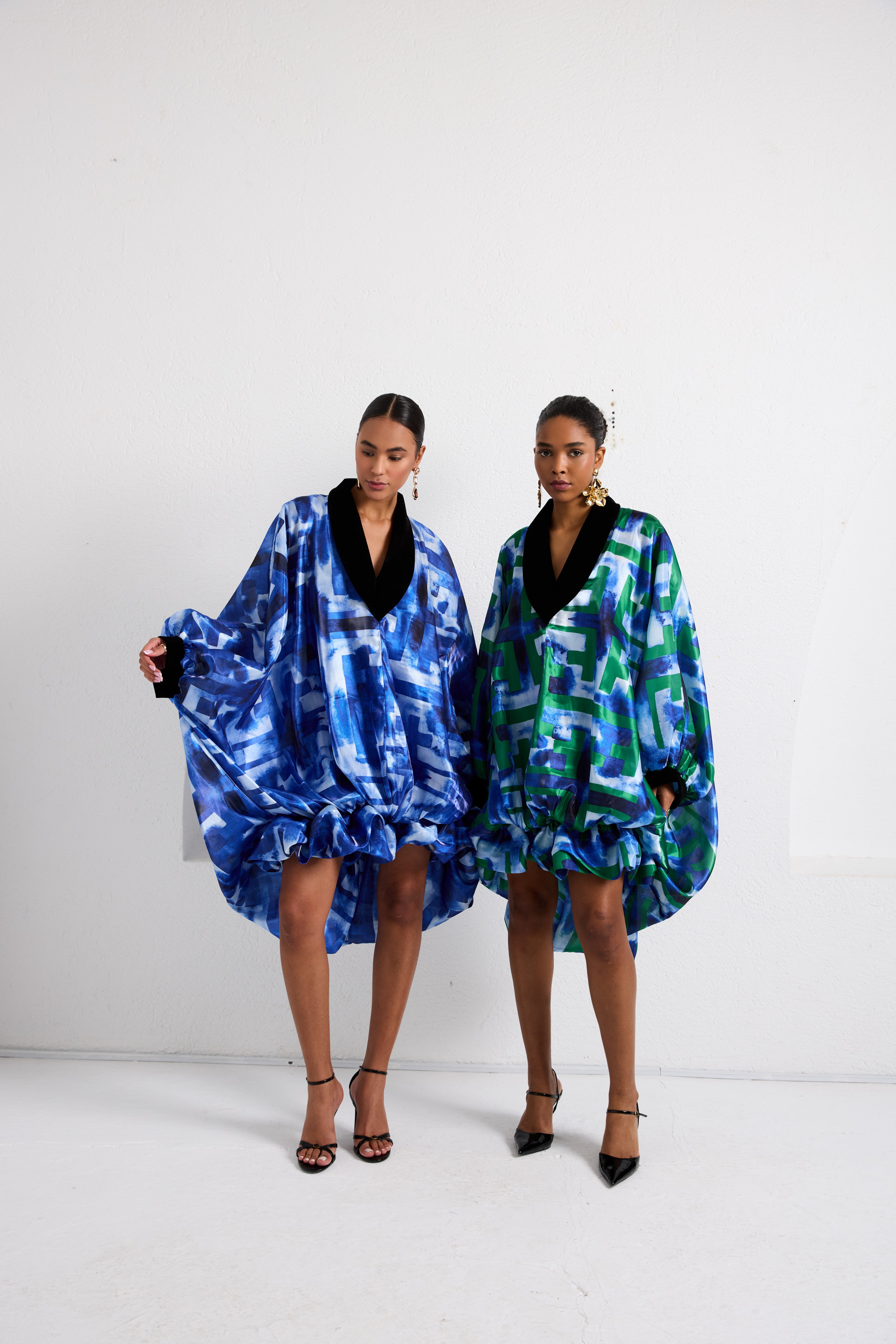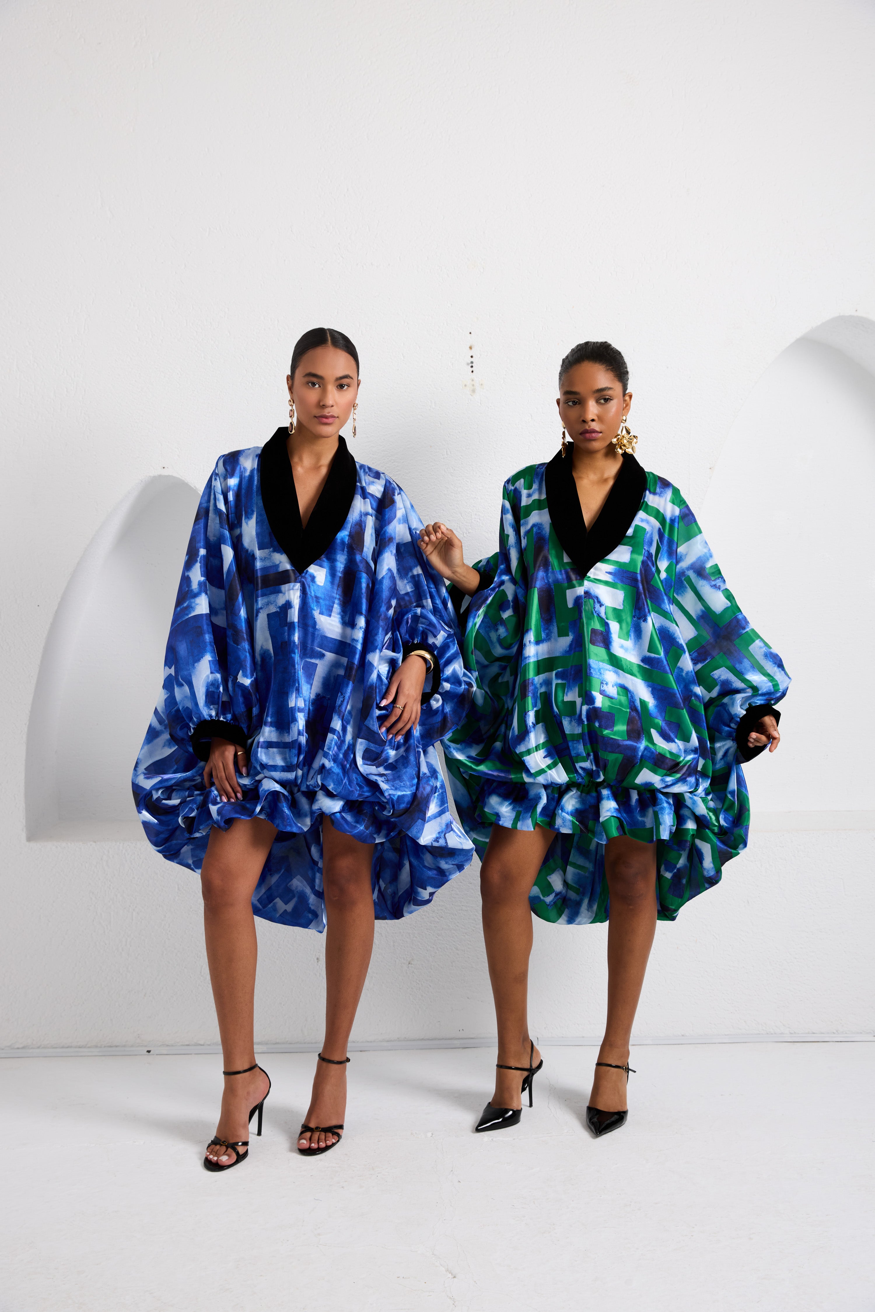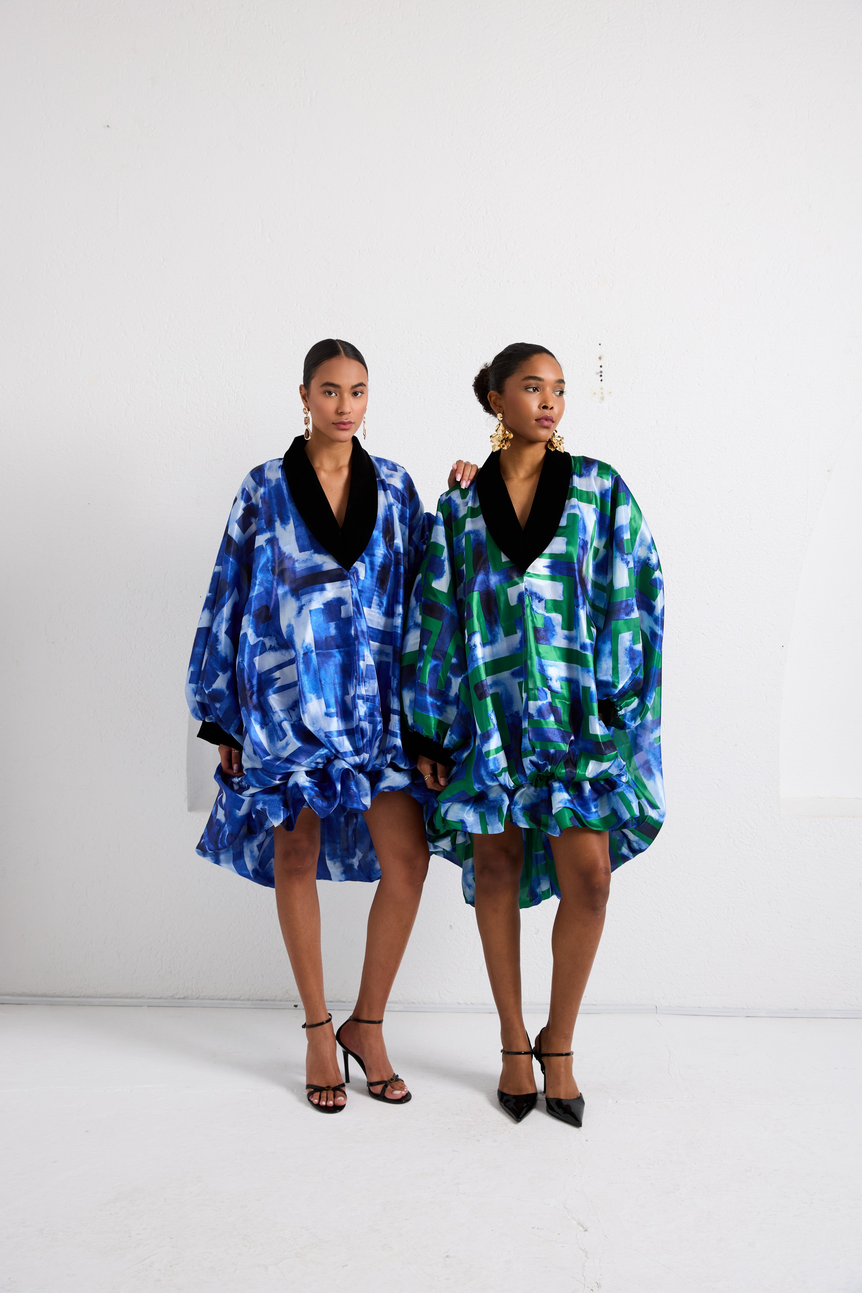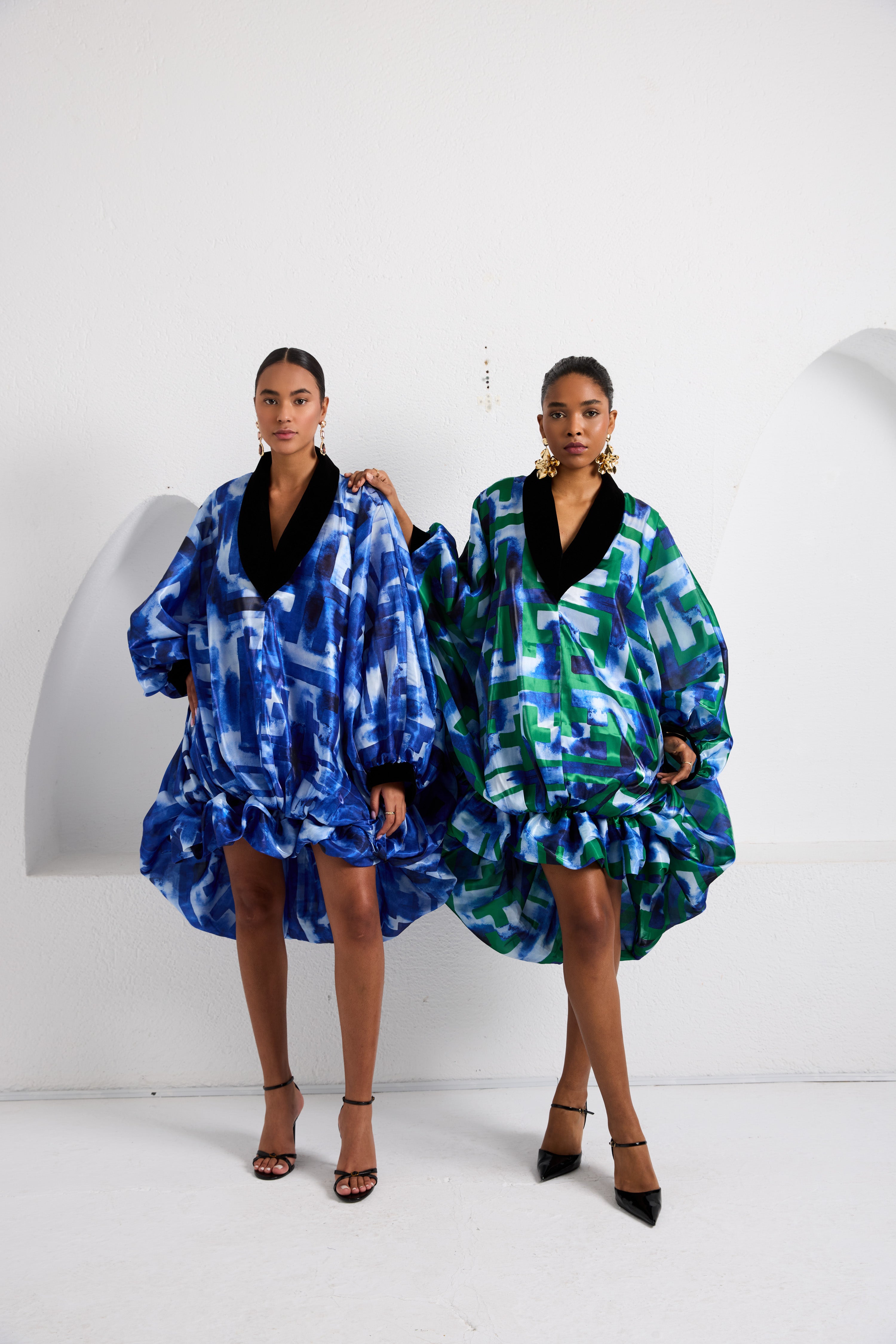 The Reverie Escape Mini Kaftan brings the same voluminous artistry as the maxi, with deep balloon folds, velvet-trimmed accents, and a fluid drape that moves with confidence and ease. Cut in Biageli’s iconic Escape Grid print, this mini kaftan captures the spirit of release and renewal, a nod to the founder’s own journey of transformation and freedom. Designed as one size fits all, it flatters across body types with its airy silhouette and sculptural movement. Fabric: Organza (fully lined); Fit: One size fits all: Front Length: 90 cm